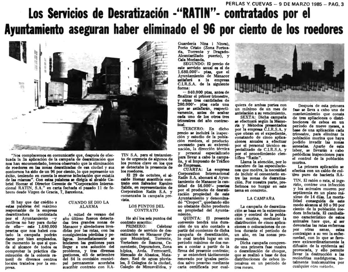 En la imagen número 12 se puede ver un recorte del periódico ‘Perlas y Cuevas’ de Manacor, edición del sábado 9 de marzo de 1985. Se trata de una noticia muy interesante donde se detalla la desratización llevada a cabo por CIRSA en la población de Manacor, Mallorca. El tratamiento estaba previsto bajo la premisa de entonces de ‘campaña de desratización’. En el caso de Manacor consistía en cinco aplicaciones anuales. Por lo que se explica en la noticia, después de la tercera aplicación los responsables de CIRSA decían que habían observado la eliminación en las zonas tratadas del 96% de roedores. En la noticia se explica que la campaña empieza con dos aplicaciones de choque en las que se distribuyen cebos de manera intensiva en un período de tres meses. Después se lleva a cabo un mantenimiento mediante tres aplicaciones de cebos en un período de nueves meses. Por tanto, aplicaciones trimestrales.
