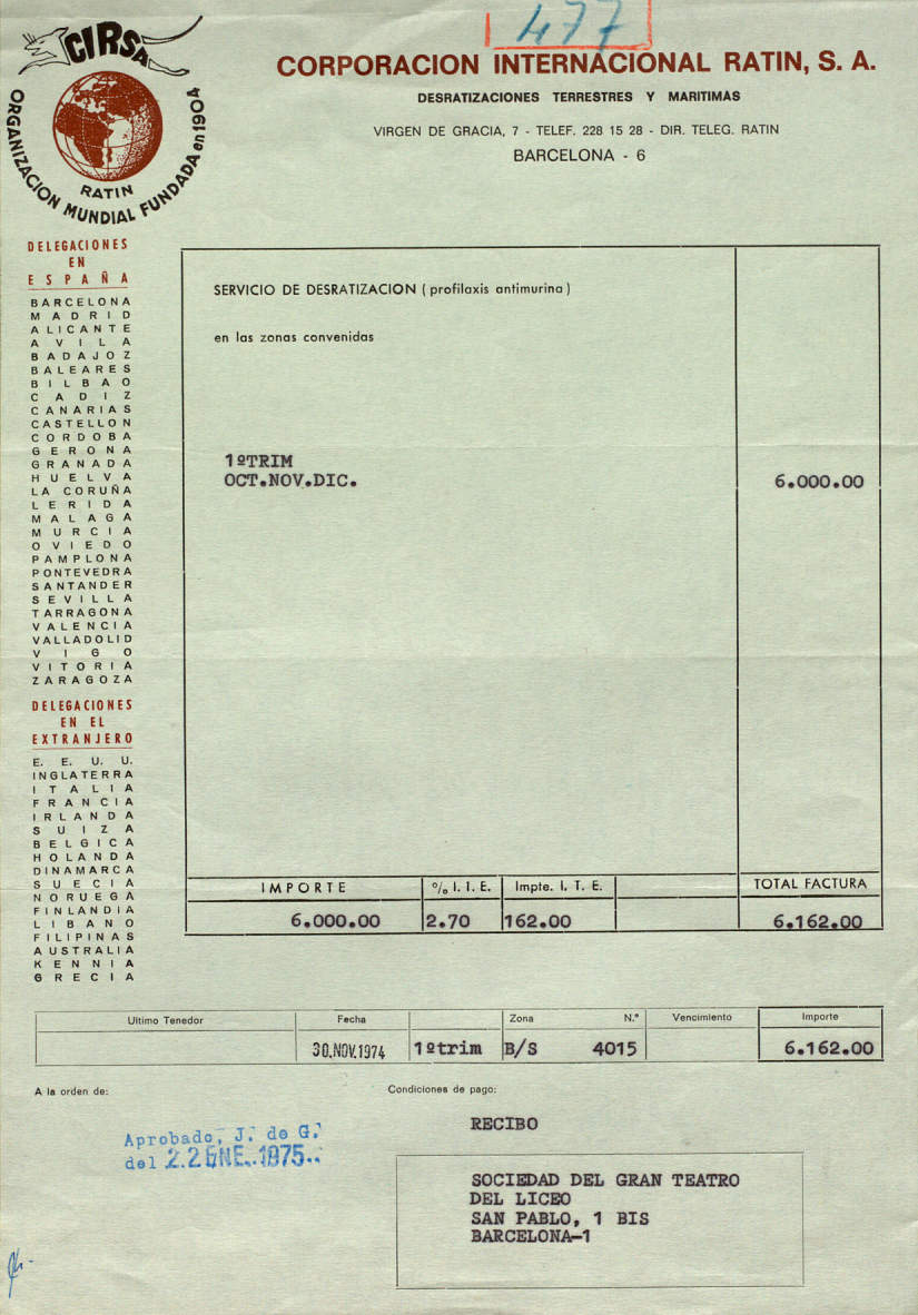 En la imagen número 11 se puede ver una factura de enero de 1975 emitida por CIRSA por los servicios prestados a la Sociedad del Gran Teatro del Liceo de Barcelona. Toda la correspondencia de esta empresa destilaba cierta grandilocuencia como en la carta de 1961. Así que en el lateral izquierdo aparecen las delegaciones en España y en el extranjero. Para entonces, CIRSA contaba con 29 delegaciones en España con implantación en Canarias y Baleares. Por lo que sé, CIRSA y Laboratorios IBYS eran las únicas compañías de control de plagas con implantación en todo el territorio. También en el lateral izquierdo, aparecen los países donde se encuentra la organización internacional. Aparecen 17 países, cuatro más que en 1961. Estos nuevos son Filipinas, Australia, Kenia y Grecia. De hecho, esto países fueron mercados abiertos por Rentokil desde Inglaterra.