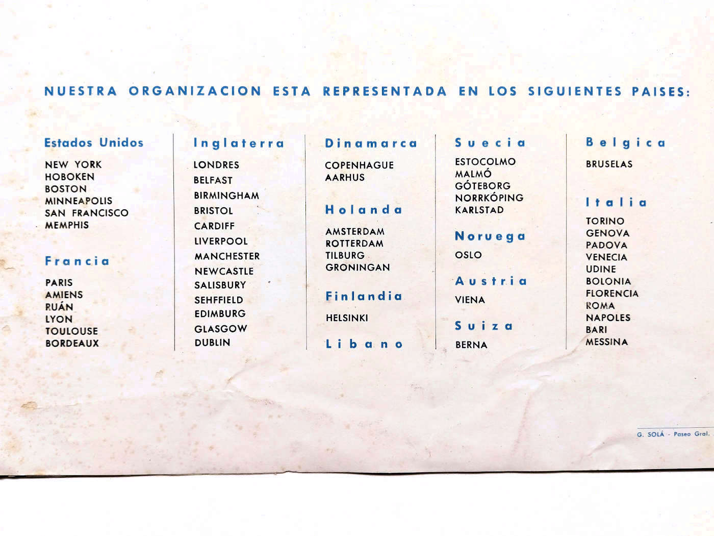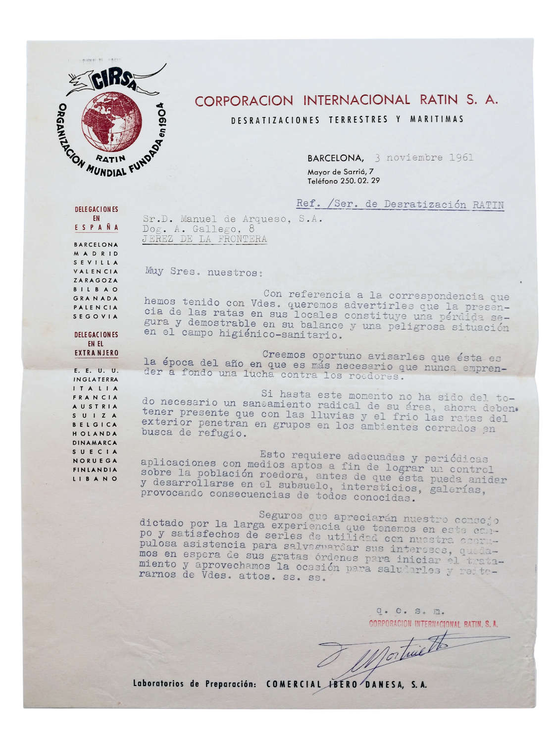 CIRSA se instaló en Barcelona en la calle Mayor de Sarriá, 7, tal y como se puede ver en la carta comercial. Por lema llevaba «desratizaciones terrestres y marítimas». Y en el lateral izquierdo de la carta, además de aparecer las nueve delegaciones se pueden leer las 13 delegaciones extranjeras: EEUU, Inglaterra, Italia, Francia, Austria, Suiza, Bélgica, Holanda, Dinamarca, Suecia, Noruega, Finlandia y Líbano. Todas las delegaciones formaban una organización llamada The International Ratin Organization.