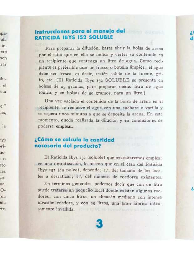 Otro documento que destaco es el folleto sobre el Raticida IBYS 152 Soluble (figuras 4 a 8). Este producto fue otra notable innovación, ya que permitía dar solución a las desratizaciones donde la competencia alimentaria era importante como graneros, fábricas de harinas, procesadoras, etc. Dediqué una entrada a este producto que tuve oportunidad de utilizar cuando empecé en control de plagas [5]. Lo que no sé es en que año fue comercializado. Es probable que hacia 1960 si tenemos en cuenta que en el folleto se menciona que es «una nueva presentación del RATICIDA IBYS 152».