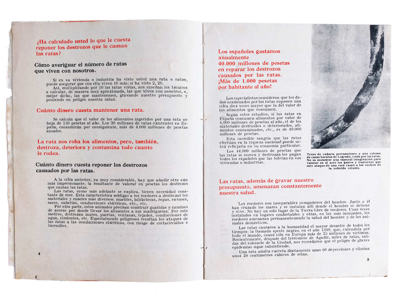 Finaliza el folleto así: «Para salvaguardar nuestra salud y nuestra hacienda hay que desratizar. pero para que las ratas no vuelvan a invadir nuestras viviendas o industrias hay que mantener los cebos constantemente. Este seguro de vida cuesta muy pocas pesetas al año».