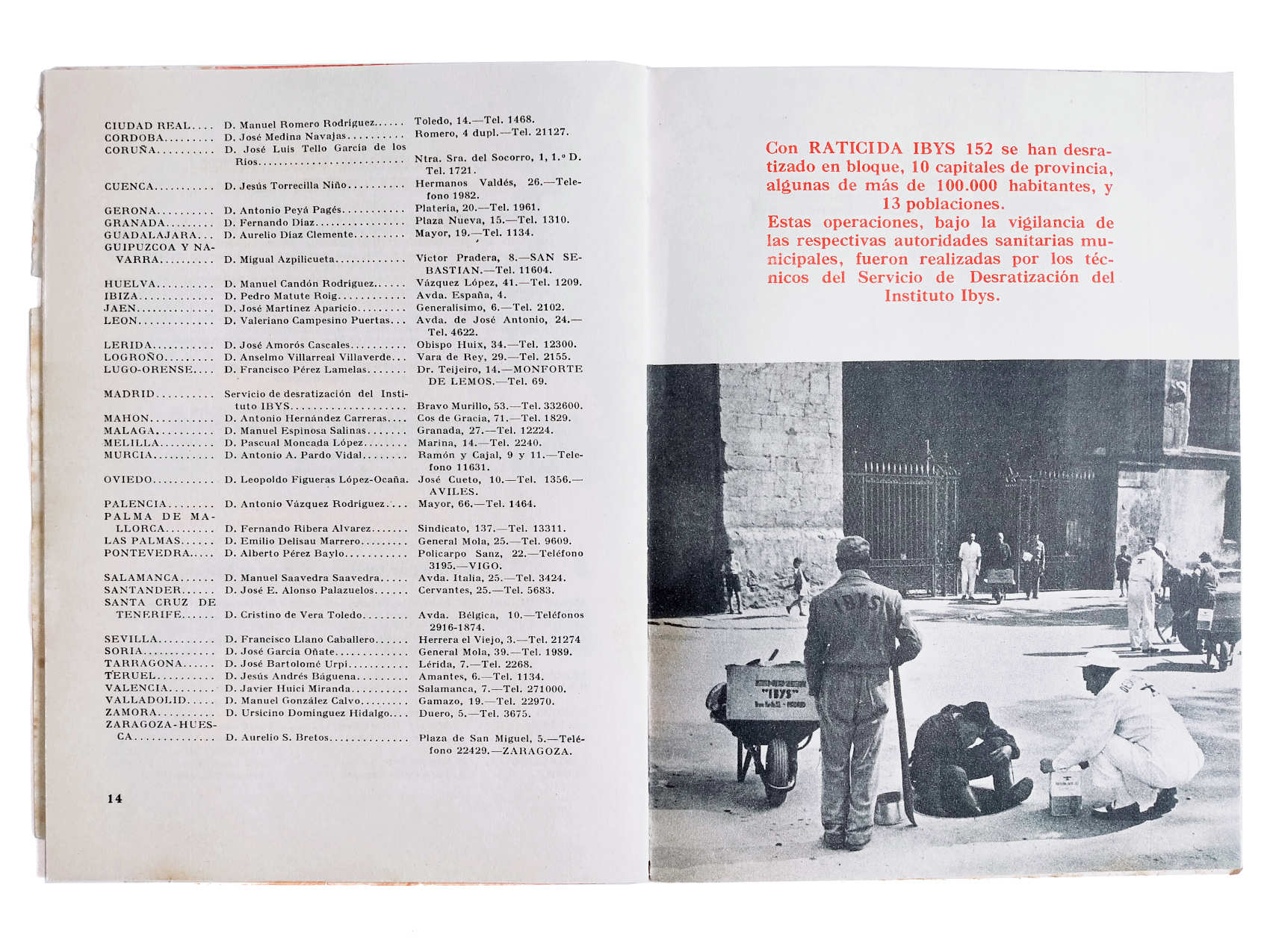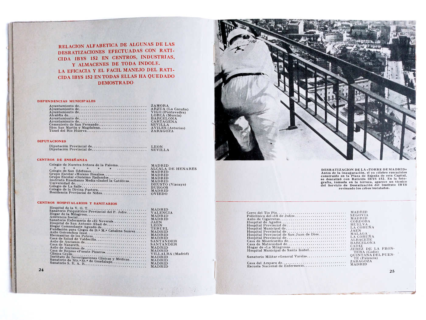 El folleto de 1960 está dividido en dos partes. En las imágenes 9 a 16 se puede ver parte de su contenido. La primera parte ocupa hasta la página 12. Se describe y justifica el Raticida IBYS 152. Se explican los daños causados por las ratas, las características del raticida y cómo de debe utilizar. En la segunda parte se presenta el Servicio de Desratización. En las páginas 13 y 14 (figuras 11 y 12) aparece la relación de representantes en cada una de las provincias de España. Se da el nombre, dirección y teléfono de contacto. Luego se dedican varias páginas a explicar las desratizaciones realizadas en 23 ciudades, 10 de las cuales son capitales de provincia (figura 13). Se muestran algunos certificados de importantes ciudades firmados por los respectivos alcaldes donde dan cuenta del éxito de las campañas realizadas (figura 14). Y desde la página 24 a la 38 se muestra una «relación de algunas desratizaciones efectuadas con Raticida IBYS 152 en centros, industrias y almacenes de toda índole» (figuras 14 a 16). La lista es larga y da cuenta de todo tipo de locales. Esta parte va acompañada de magníficas fotografías con operarios realizando las labores de desratización.