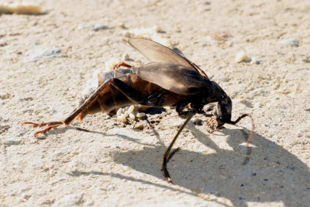 Encontré una hembra de castañeta de la vid (Vesperus xatarti) con dos extremidades rotas y toda la puesta fuera (figura 1). Estaba en un camino (figura 2). Tenía el aspecto de haber recibido un pisotón. La puesta me pareció impresionante por el gran número de huevos. Estaban aglutinados formando un paquete. La hembra segrega una sustancia adhesiva que se endurece en contacto con el aire. Si esta hembra hubiera conseguido colocar sus huevos, lo habría hecho bajo la corteza de una planta formando una plasta. Según mi cálculo, esta puesta contiene alrededor de 900 huevos. Como se puede ver, tienen forma alargada y miden unos 2 mm de longitud. Si observamos la gran cantidad de huevos, nos haremos una idea de lo abultado que debía tener el abdomen antes de la puesta accidental.