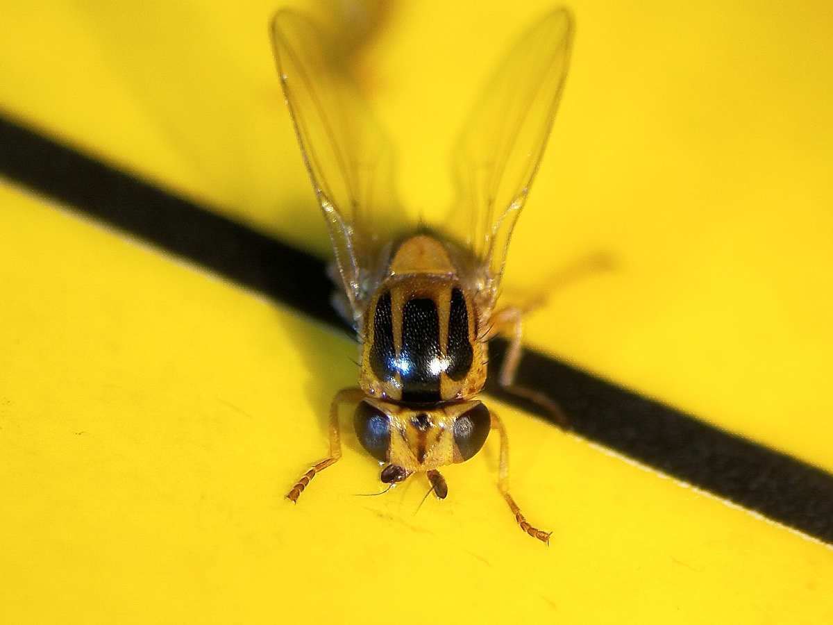 La mosca Thaumatomyia notata es característica por su pequeño tamaño, hasta 3 mm de longitud, y por su aspecto inconfundible. En las imágenes se pueden ver individuos que encontré atrapados en planchas adhesivas de aparatos insectocaptores colocados en un cliente de Barcelona. El adulto tiene la cabeza, tórax y patas de color amarillo. Destaca el abultado tórax con manchas negras longitudinales de las que sobresalen tres gruesas en la parte superior. En la cabeza destacan los grandes ojos y las gruesas bases de las antenas. El género Thaumatomyia se puede confundir con otras especies de la subfamilia Chloropinae como las género Chlorops. Sin embargo, hay que hacer una atenta observación y comparar venación alar, forma de las manchas, forma de cabeza y ojos, etc.