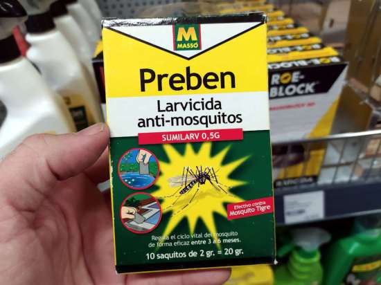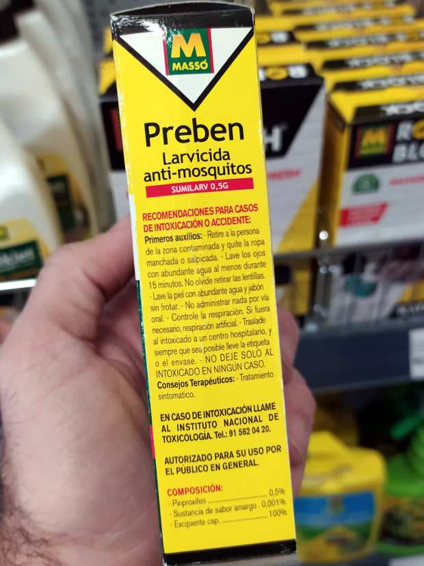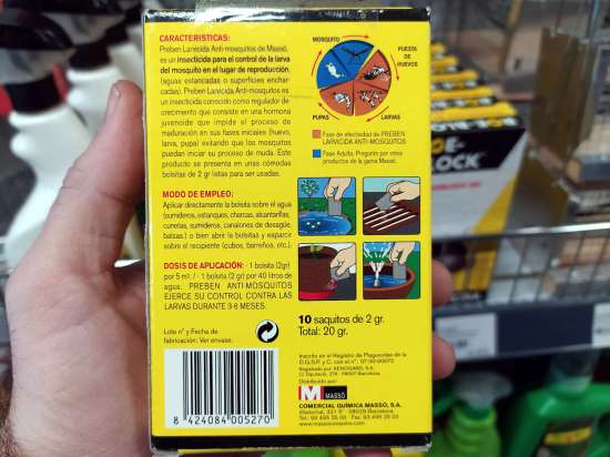 Hace unos días entré en una ferretería para comprar unos arrancadores de fluorescentes. Al pasar por la sección dedicada al control de plagas, me paré para ver qué vendían. Es algo que suelo hacer. Y más cuando visito un establecimiento que no conozco como en esta ocasión. En el apartado dedicado a mosquitos, vi un envase de Sumilarv 0.5G, producto larvicida que Comercial Química Massó SA comercializaba para uso doméstico como Preben Larvicida Anti-mosquitos (figura 1). Este producto contiene piriproxifén al 5,1% como materia activa. El contenido del envase eran 10 bolsas de papel con 2 gramos de contenido cada una (figuras 8 y 9).