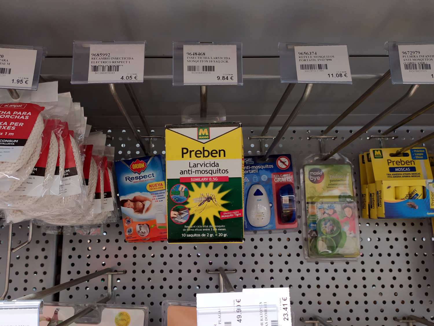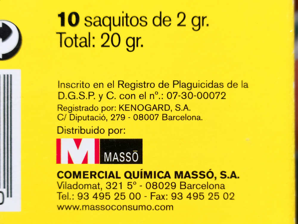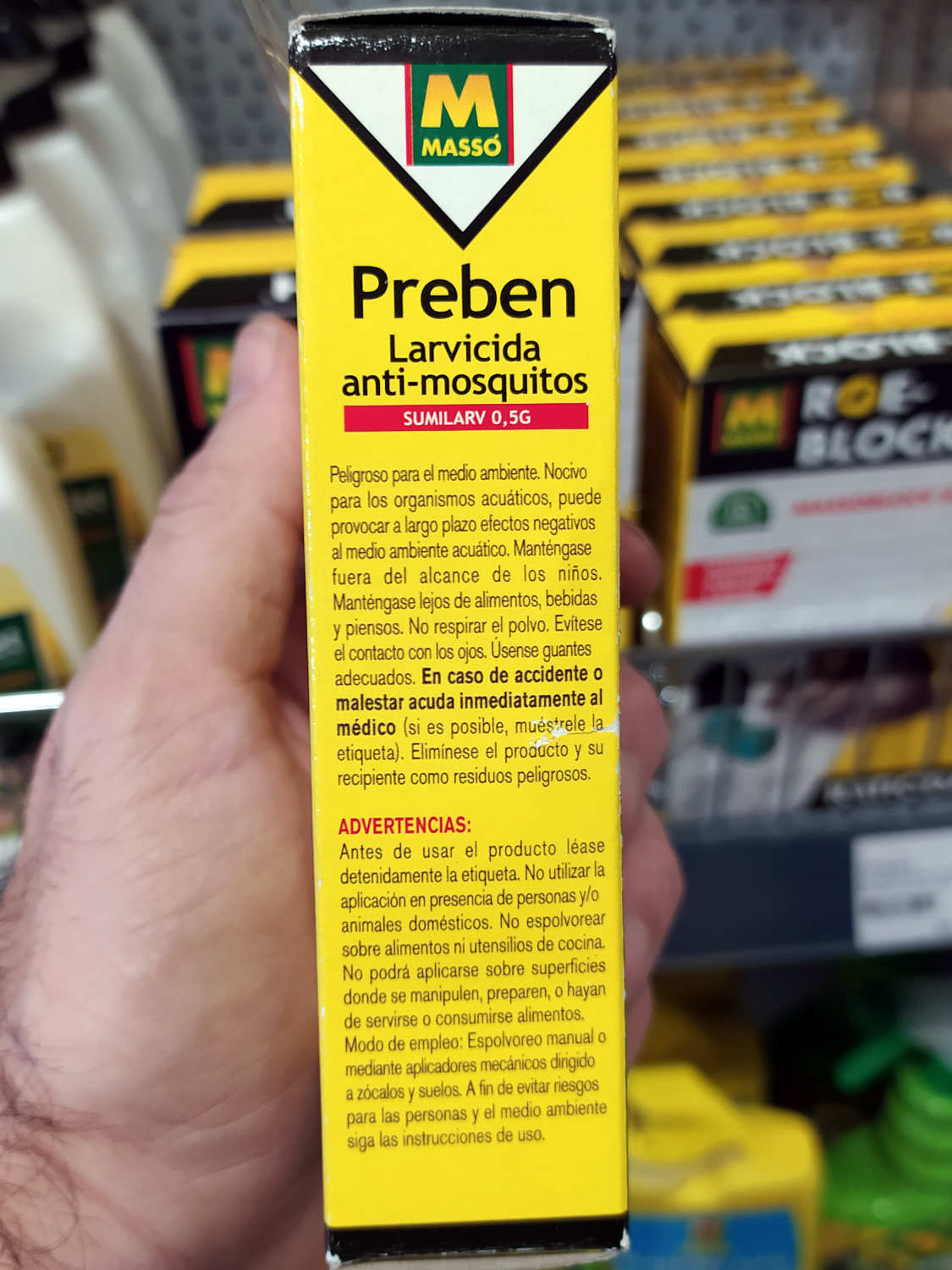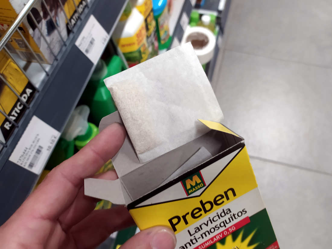 Hace unos días entré en una ferretería para comprar unos arrancadores de fluorescentes. Al pasar por la sección dedicada al control de plagas, me paré para ver qué vendían. Es algo que suelo hacer. Y más cuando visito un establecimiento que no conozco como en esta ocasión. En el apartado dedicado a mosquitos, vi un envase de Sumilarv 0.5G, producto larvicida que Comercial Química Massó SA comercializaba para uso doméstico como Preben Larvicida Anti-mosquitos (figura 1). Este producto contiene piriproxifén al 5,1% como materia activa. El contenido del envase eran 10 bolsas de papel con 2 gramos de contenido cada una (figuras 8 y 9).