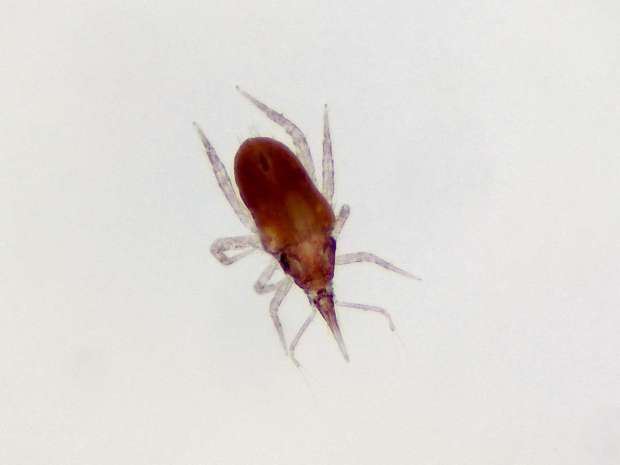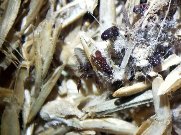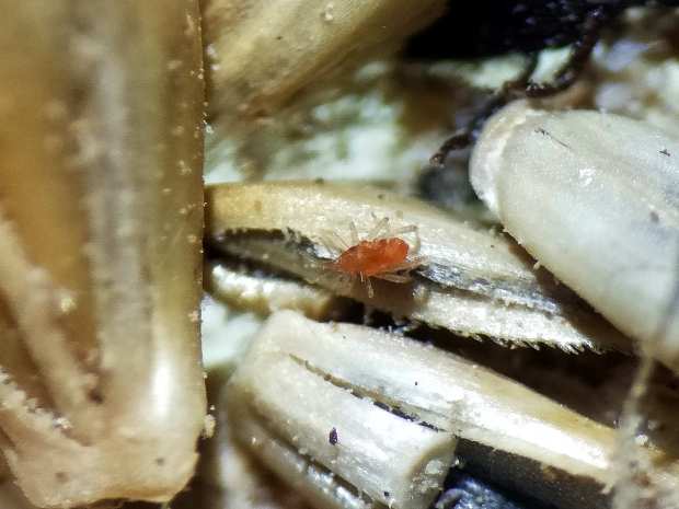 Y en último lugar, tenemos los arácnidos. He encontrado depredadores. Seguramente habría alguna especie plaga de productos almacenados, pero no los he buscado. He encontrado un par de individuos del orden Pseudoescorpiones. Es habitual encontrar en los almacenes de granjas. Y por otra parte, he encontrado bastantes individuos de alguna especie de ácaro de la familia Bdellidae, orden Trombidiformes. Estos ácaros son característicos por su forma. Consta el género Bdella en la bibliografía [1].