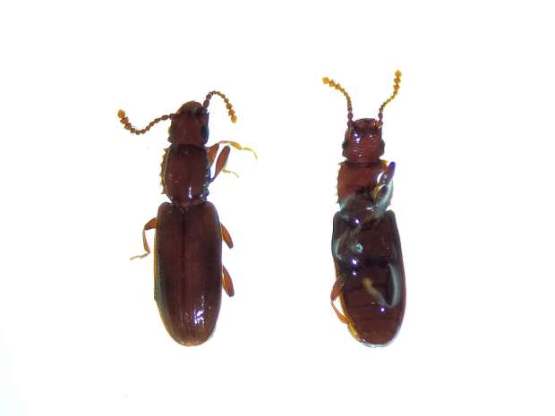 Respecto a los coleópteros que son plaga secundaria, había tres especies. Cada una pertenecía a una familia diferente: Oryzaephilus surinamensis (Silvanidae), Rhyzopertha dominica (Bostrichidae) y Cryptolestes (Laemophloeidae). Cuando encuentro Cryptolestes no me entretengo en saber de qué especie en concreto se trata. Tenemos por lo menos cinco especies que pueden concurrir en alimentos. No es fácil su determinación y todavía no me he adentrado en ello.