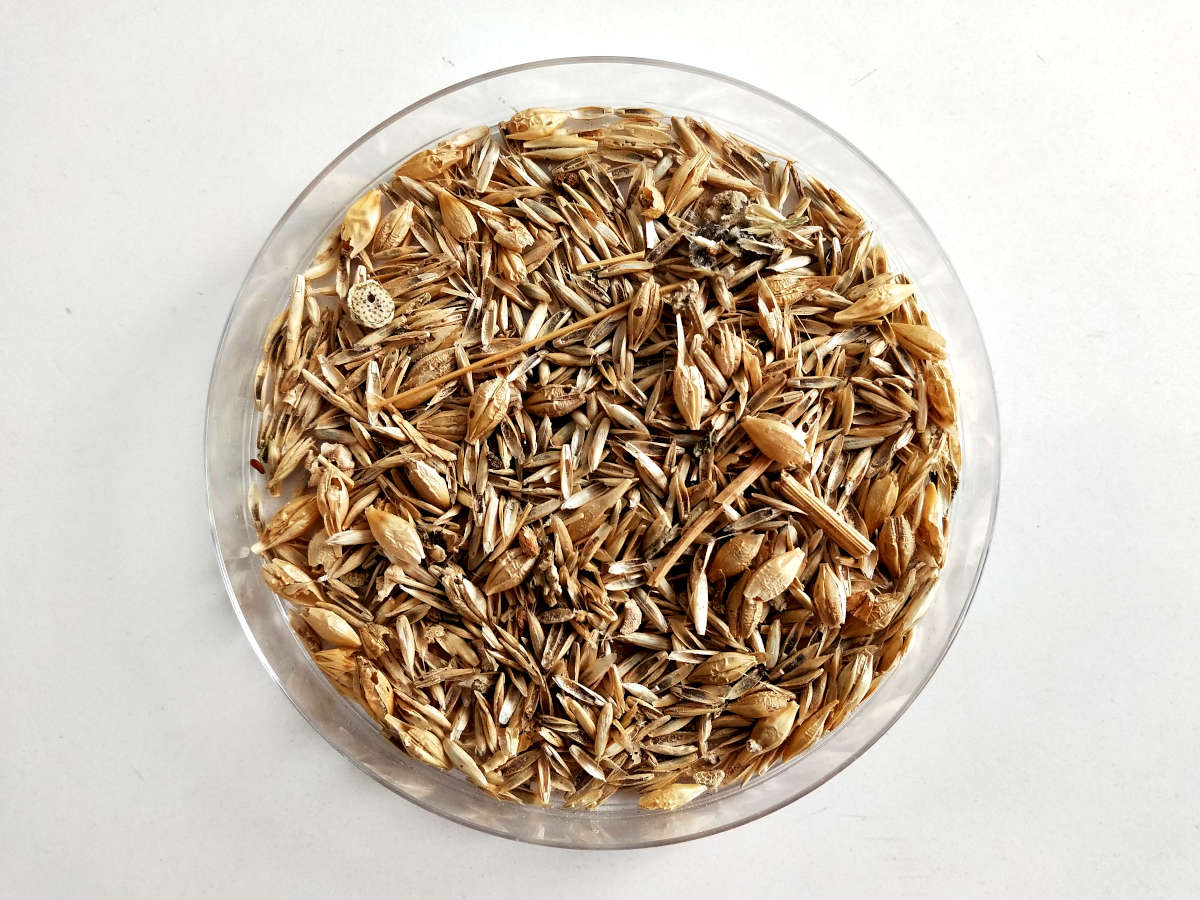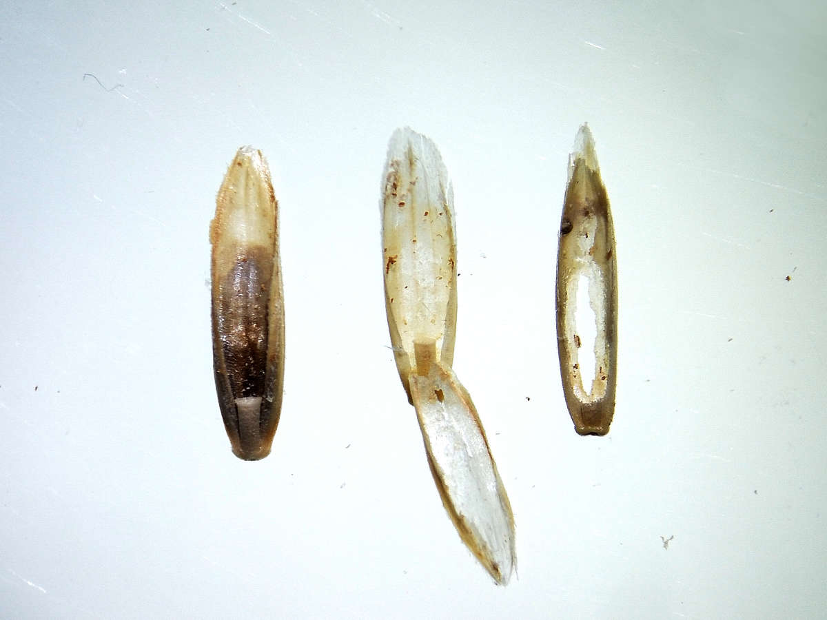 En un almacén había varios sacos con granos de cereal. Sobre uno había coleópteros especializados en degradar los granos. Como sabemos, los coleópteros forman el grueso de las plagas de los productos almacenados. Le comenté el caso al cliente para que tuviera cuidado y no pasaran a otro saco. Me dio permiso para abrir el saco. Aproveché para recoger una pequeña muestra. En el saco había raigrás (Lolium multiflorum) y cebada (Hordeum vulgare).