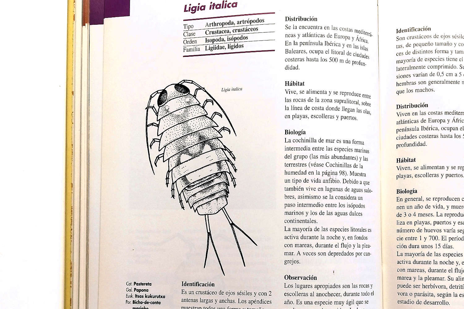 La guía ‘Animales de nuestras ciudades’ dedica una completa ficha a la Ligia (figura 2) [1]. Esta guía publicada en 1997 la tengo como referencia en cuanto a animales urbanos. Tengo varios libros de divulgación que tratan esta temática, pero sin duda esta guía es la mejor. Es extensa y con fichas bien trabajadas que describen las especies comunes en la Península Ibérica. Tiene además un buen nivel científico reflejo del nivel de sus autores.