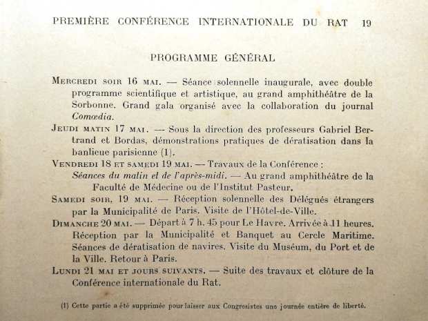 La segunda conferencia transcurrió entre el miércoles 7 y el lunes 12 de octubre. La participación fue mayor. He contado delegados de 57 países y colonias. Luego hubo muchos otros pertenecientes a diversas administraciones, asociaciones, cámaras de comercio y compañías químicas y navieras francesas. También hubo participantes a título personal. En esta ocasión no hubo ningún delegado de España. He contado 74 exposiciones de todo lo relacionado con la desratización: productos, métodos, enfermedades, normativa, etc.