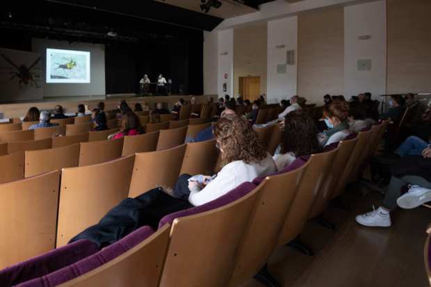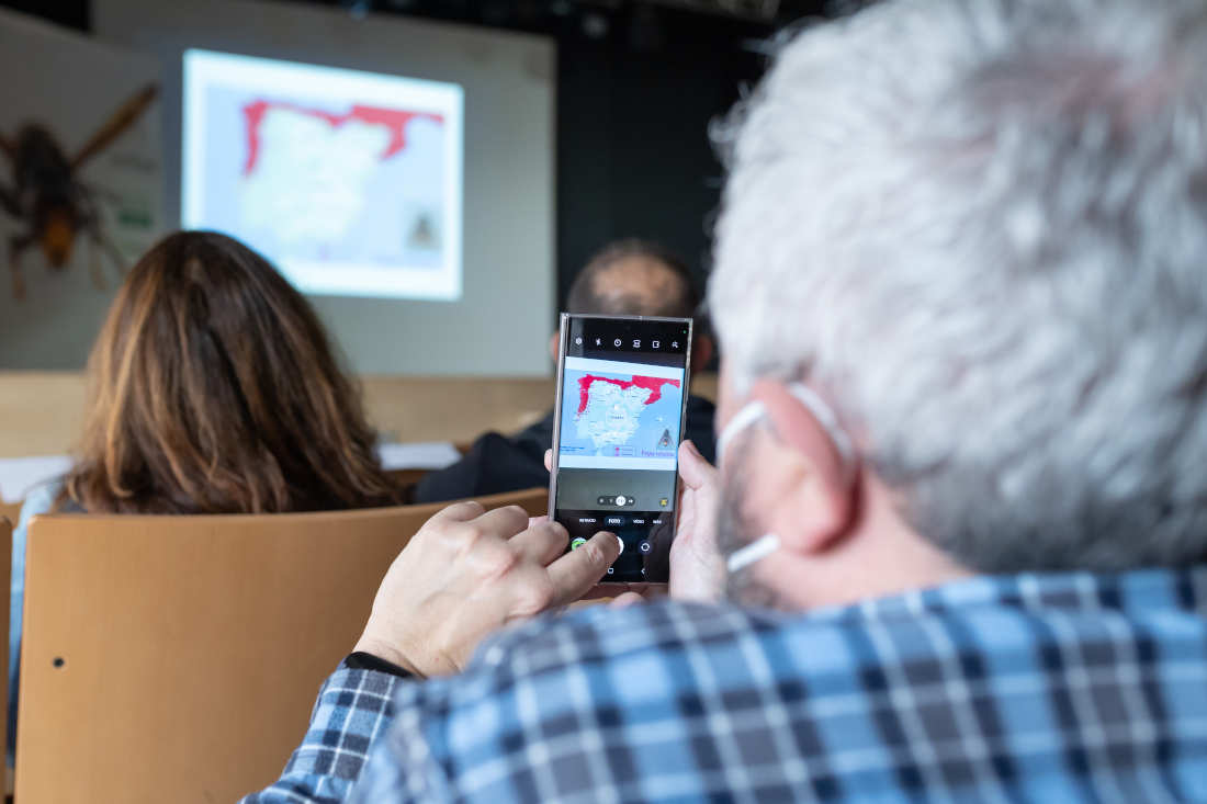 La jornada constó de cinco ponencias (ver programa en figura 2). La primera estuvo a cargo de Leopoldo Castro, entomólogo experto en Vespidae, que nos habló sobre la distribución actual de las avispas invasoras en la Península Ibérica y su impacto. El título de la ponencia fue ‘El género Vespa en la Península y Baleares: situación actual y perspectiva’. Fue un lujo que Leopoldo Castro participase. No solo tiene un gran conocimiento del tema, sino que es una persona generosa. Desde hace años dedica su tiempo en la identificación de avispas en varias plataformas de ciencia ciudadana. En enero publicó un artículo con Carlos del Pico, quien también estuvo en la jornada, donde da cuenta de la expansión de Vespa orientalis en el sur de España [1]. Gracias a este artículo sabemos que esta especie tiene un impacto importante sobre el ecosistema y, aunque sea una especie nativa del este de Europa, no lo es de la Península Ibérica. Son muchas las cuestiones que se trataron en esta ponencia y dejó claras algunas ideas que considero importantes sobre la Vespa velutina como es su área de establecimiento y la posibilidad de su expansión. Aprendimos mucho.