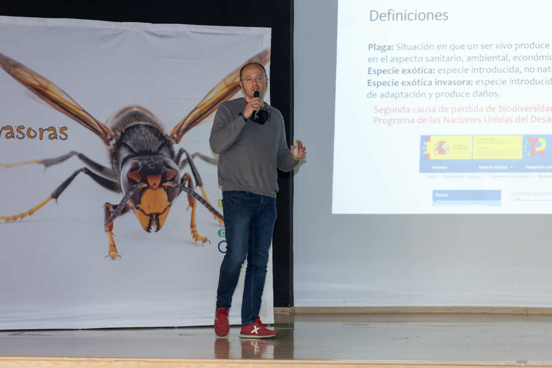 Luego vinieron tres ponencias dedicadas a las tres especies invasoras. Cada una fue expuesta por personas expertas en el control de plagas que llevan años tratando a estas especies en su terriorio. En primer lugar, sobre Vespa velutina habló Antoni Armengol de Anura de Sant Celoni, Barcelona: ‘Vespa velutina en Cataluña. Evolución, comportamiento y gestión’. Luego, sobre Vespa orientalis habló Javier García de Estudi Verd de Torrent, Valencia: ‘Vespa orientalis, ¿llegó para quedarse?’. Y después, sobre Vespa bicolor tuvimos a Álvaro García de Lucanus Control de Málaga: ‘Vespa bicolor en Málaga: comportamiento y control’.