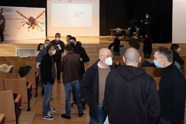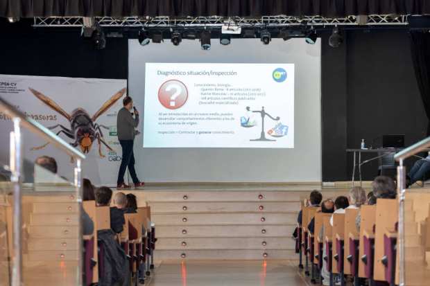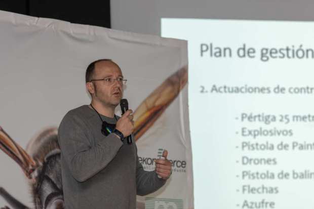 La última y quinta de las ponencias estuvo dedicada a diversos aspectos a tener en cuenta sobre las actuaciones contra véspidos invasores. Fue expuesta por Roger Vila de Grup Gepork SA de les Masies de Roda, Barcelona, bajo el título ‘Aspectos a tener en cuenta en actuaciones de control’. Se explicó al público los problemas en los que se ha cayó en Cataluña cuando llegó la avispa asiática. Muchos se pusieron a realizar tratamientos sin formación y con métodos dispares que hacían más mal que bien. Se explicó los métodos correctos y los que no deberían estar autorizados. Y se dijo quiénes estaban preparados y legalmente podían hacerlo, es decir, las empresas especializadas del sector de control de plagas.