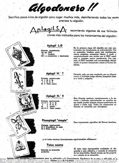 Además de Fumigol, Aplagil comercializaba otros muchos productos insecticidas para el campo bajo marcas como Aplagil, Fluoaplagil, Bordex, Proxemil, Plagodón, etc. La marca más importante era Aplagil que tuvo hasta 17 formulados a base de DDT y lindano para diversos usos (figura 5) [6]. También hubo Aplagil Suelo, Aplagil Defoliante, Aplagil Anticriptogámico, etc. [7]. Incluso hubo un raticida llamado Rodentil que era usado por Desur SL de Málaga, «la empresa más especializada del sur de España en desratización», en sus aplicaciones (ABC de Sevilla, 31 de marzo de 1965) [8]. Rodentil estaba formulado con warfarina y sulfoquinoxalina.