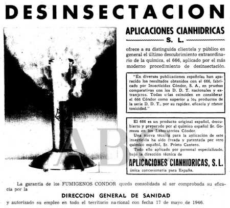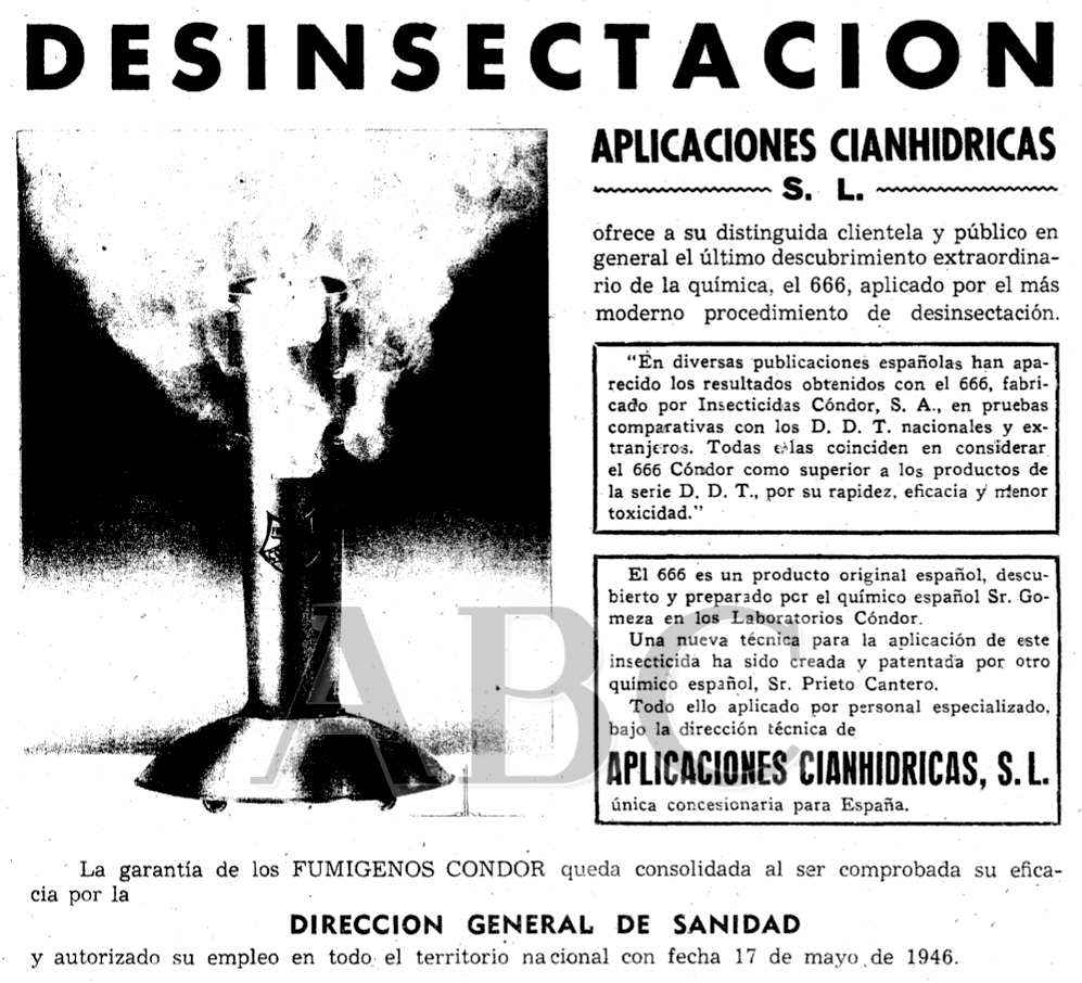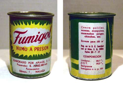 En este punto, anotar que en España había una tradición en el uso de fumígenos. De antes de la Guerra Civil habían los conos y bastoncillos a base de pelitre contra mosquitos. Muy celebrados. A finales de la década de 1940 empezaron a comercializarse los papeles fumígenos con lindano para el mercado doméstico. Destaca también el cigarro insecticida FUM de Fernando Tello Millera, fundador de Industrias Químicas Tello de Castellón, que comercializó a finales de la década de 1940 [12]. De hecho, hubo diversidad en la propuesta de fumígenos, ya que era un método de desinsectación cómodo, rápido y económico. Dejemos a parte, la tradición española de fumigar contra chinches de cama con azufre o ácido cianhídrico.