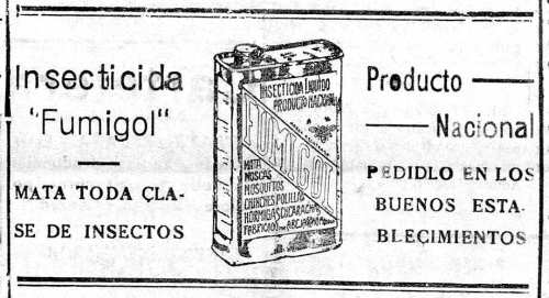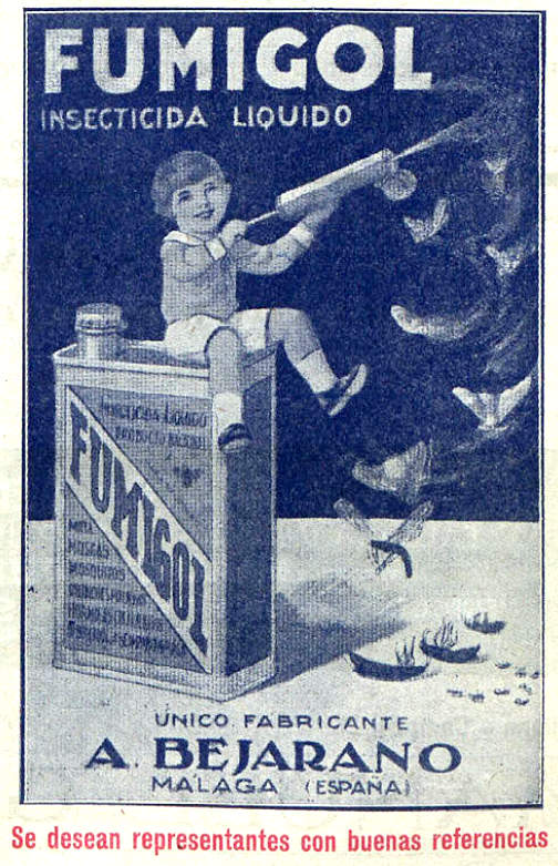 Fumigol es una marca que si no tiene un siglo de trayectoria en el mercado, poco le falta. La información más antigua que he encontrado sobre Fumigol es un anuncio publicado en 1929 en el ‘Diario Marroquí’ de Larache, ciudad del antiguo Protectorado Español de Marruecos. En la imagen número 2, se puede ver el anuncio. En el centro hay una lata en la que se lee en la parte superior: «Insecticida líquido. Producto nacional». Era un insecticida pulverizable fabricado por A. Bejarano de Málaga indicado contra todo tipo de insectos. Es probable que Fumigol fuera comercializado con anterioridad a ese año.