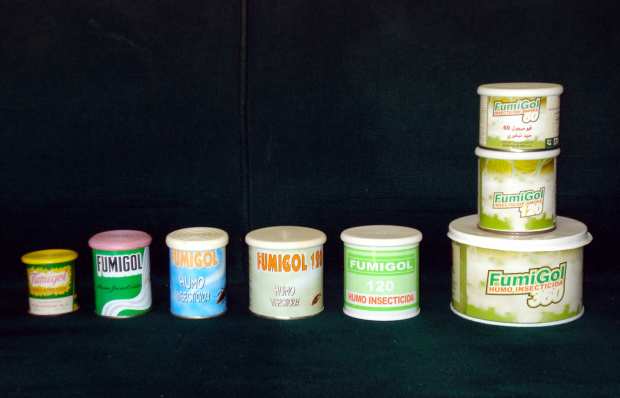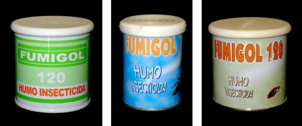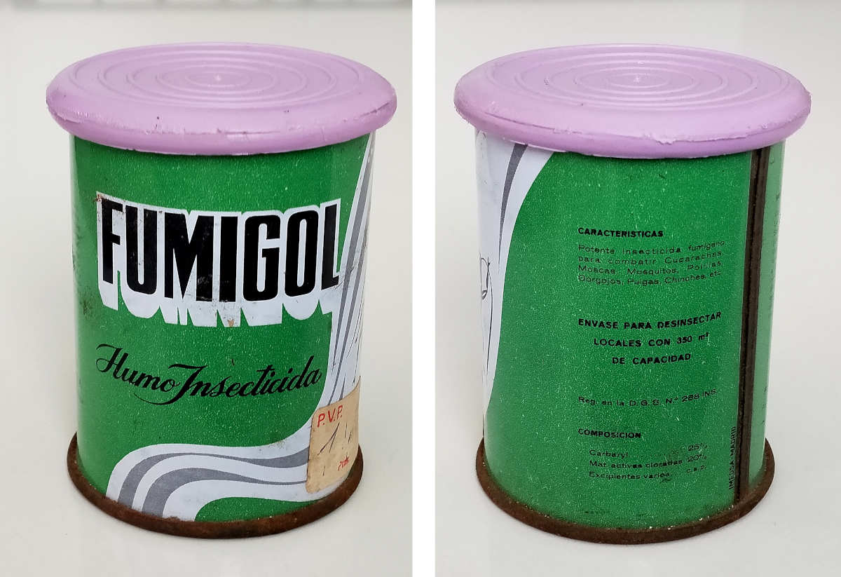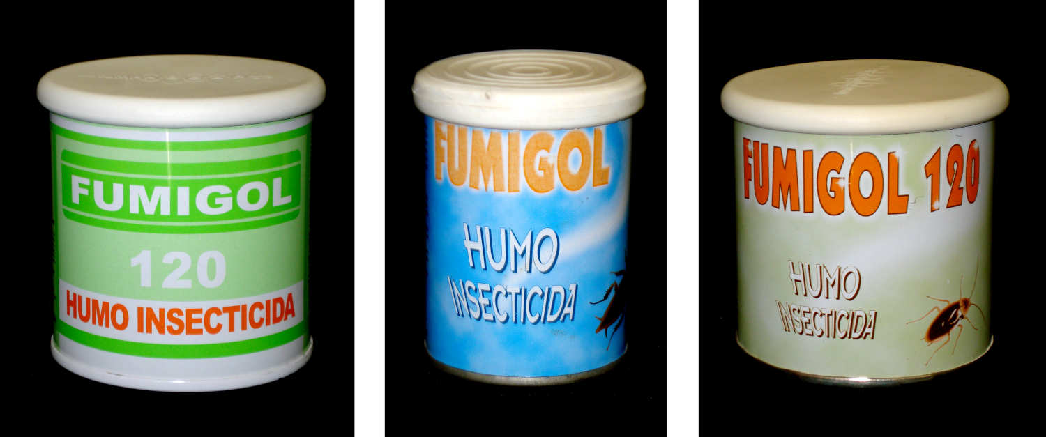 En figura 8, se pueden ver imágenes de dos envases. Ambos contienen propoxur al 30%, un carbamato de BAYER conocido también como Baygon. El de la derecha (tapa rosa) parece de la década de 1980 con número de registro de la DGS 288-INS. Y el de la izquierda (tapar gris) es de la década de 1990 con número 92-30-00319 del nuevo Registro de Plaguicidas no Agrícolas que se implementó a principios de aquella década. En la actualidad, Fumigol contiene un piretroide, cifenotrina al 3%. Es el signo de los tiempos. El número de registro actual es 13-30-06577.