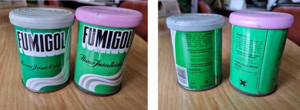 Fig 8. Botes antiguos de Fumigol con propoxur./ C. Cintora 2022