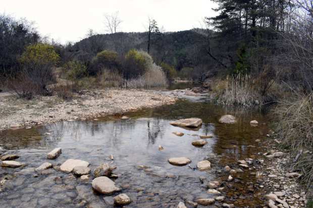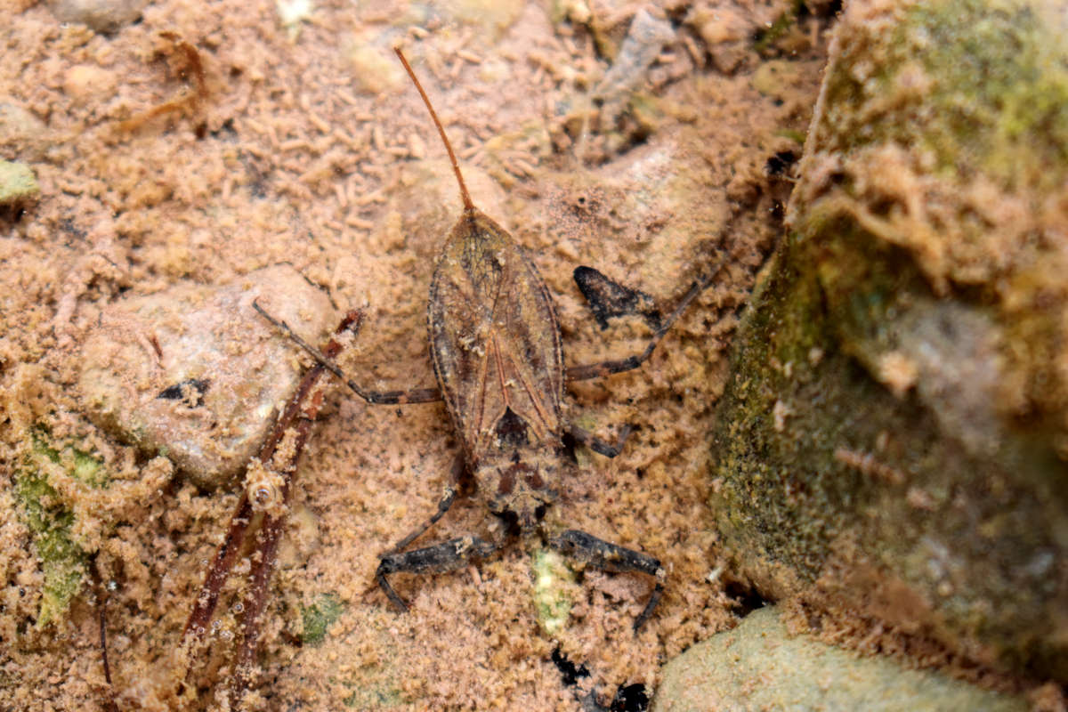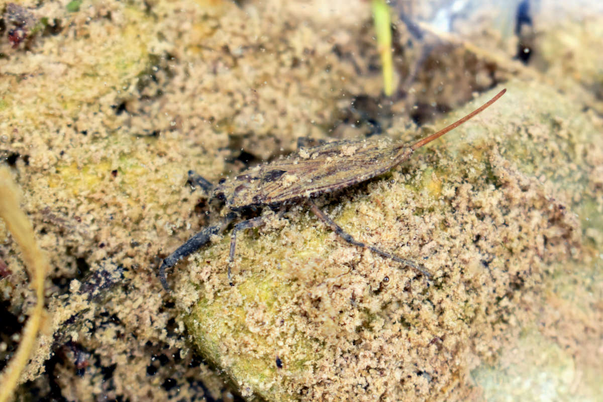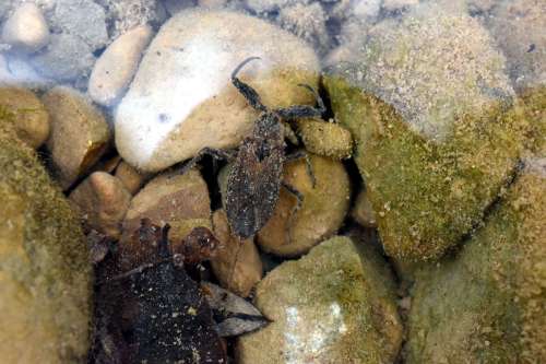 Ayer tuve la oportunidad de ver un par de adultos de escorpión de agua (Nepa cinerea) en la riera de Merlès. Se trata de un heteróptero depredador que se nutre de todo lo que encuentre [1]. En la imagen número 1, se puede ver el lugar donde los vi. Es un vado situado cerca de la carretera C-25, en el término municipal de Les Llosses, Girona. Es un buen hábitat porque las aguas bajan lentas y hay poca vegetación.