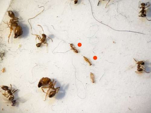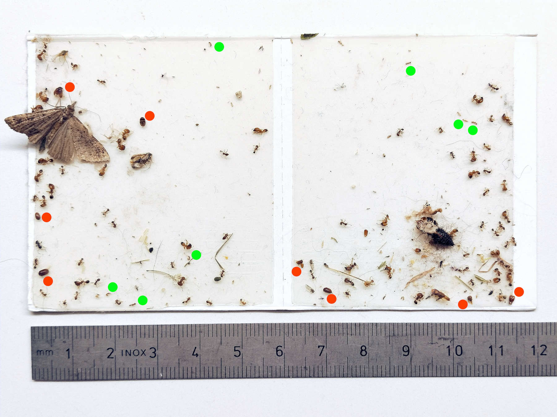 Pues bien, en la imagen número 2 se puede ver la trampa adhesiva que estaba situada justo debajo de las bolsas de heno. Al ver la diversidad de insectos atrapados, me la llevé a casa para observarla con la ayuda de la lupa binocular. En número, destacan los psocópteros de los que hay de tres géneros: Liposcelis, Lepinotus y Ectopsocus. También en número, destacan las obreras de Pheidole pallidula, hay menores y mayores. Incluso hay una obrera de Tapinoma nigerimum. Y en menor número, hay ejemplares de Lasioderma. Pero lo que llamó mi atención fueron unos himenópteros ápteros que reconocí como betílidos (Bethyidae). En la imagen número 2, se pueden ver los Lasioderma indicados mediante un punto rojo y, los betílidos, mediante un punto verde.
