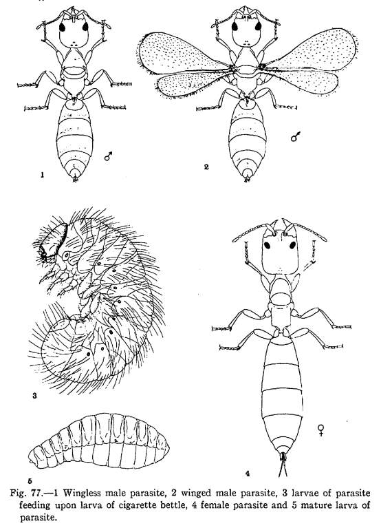 La relación entre Cephalonomia y Lasioderma viene descrita de lejos. C.W. Kearns publicó en 1934 un artículo donde dio cuenta de su relación [3]. Aparece una descripción del betílido, aunque no suficiente. En la imagen número 3, se puede ver un dibujo que publicó donde se ve el macho y la hembra. Describe los adultos así: «There are three distinct adult forms to be found in this species, the males being dimorphic. The females (Fig. 77,4) are wingless, 2 mm. to 3 mm. in length, yellowish-brown in color, and possess three minute ocelli. The wingless males (Fig. 77, 1) are 1.5 mm. to 2 mm. in length and slightly paler in color than the female. They possess three well developed ocelli, and a dark transverse band upon the caudal half of each visible abdominal segment. The winged males (Fig. 77, 2) are 1.3 mm. to 2 mm. in length and possess all the other characteristics of the wingless males, differing only slightly in the shape of the head and compound eyes».