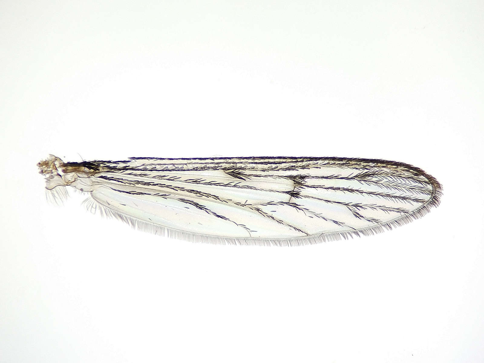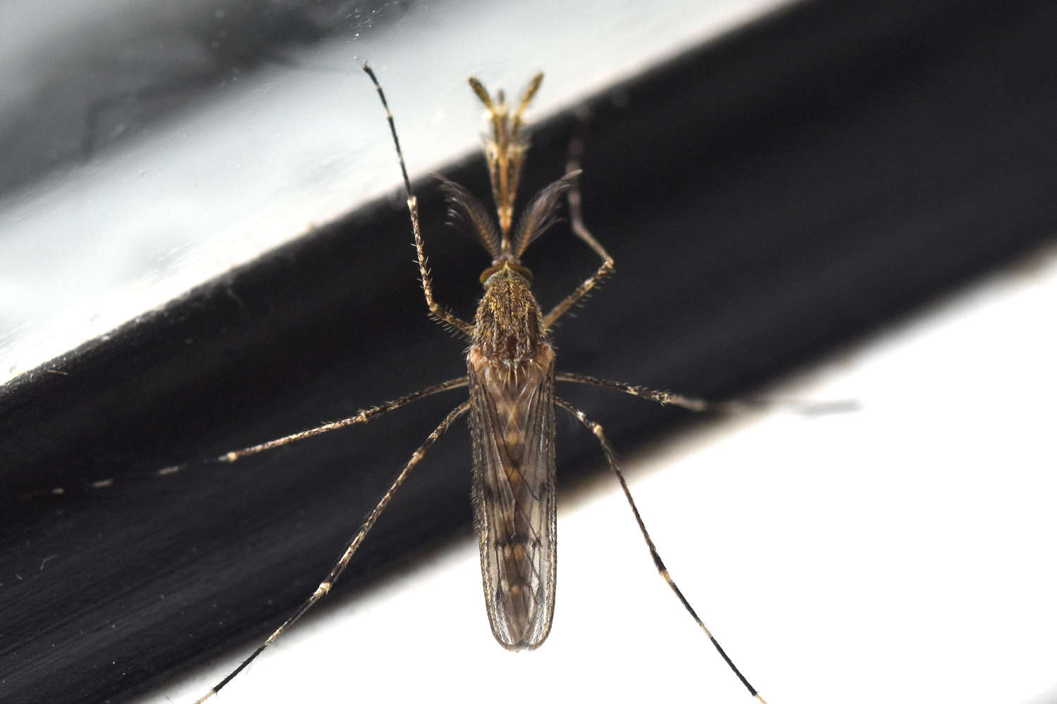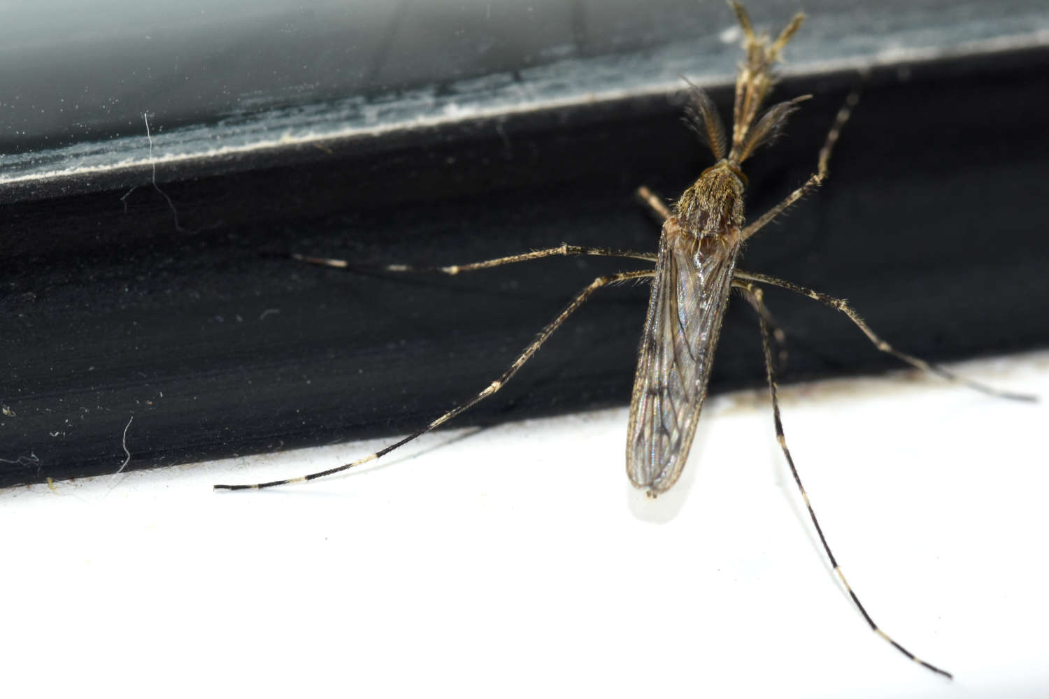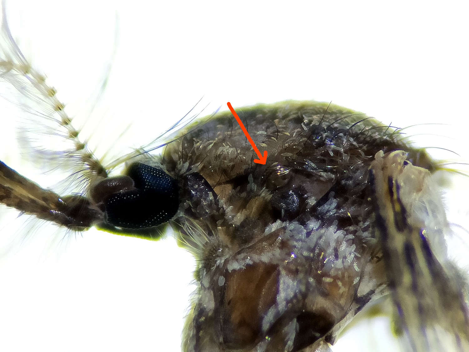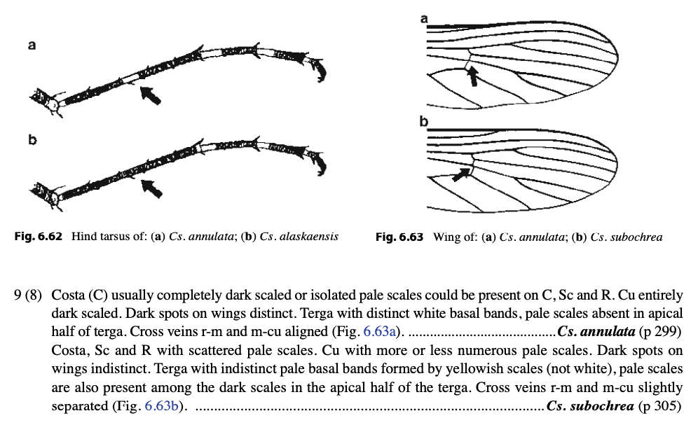 En el caso de los adultos, necesitamos también la lupa binocular. Lo primero buscar las setas preespriaculares en el lateral del pronoto. Si están presentes, estamos antes el género Culiseta (figura 7). Luego observamos un patrón determinado de manchas blancas sobre el tarso de las patas posteriores (figura 8). En la imagen número 10, se puede ver otro recorte del libro de Becker et. al. con el patrón del subgénero Culiseta. Y también está indicada la diferencia en la venación alar entre annulata y subochrea. El el caso de annulata las venas transversales r-m y m-cu se encuentran alineadas. Esto se puede ver en la imagen 11. En el resto de imágenes, se pueden ver machos y hembras adultas de la muestra que recolecté.