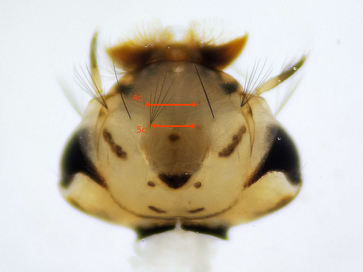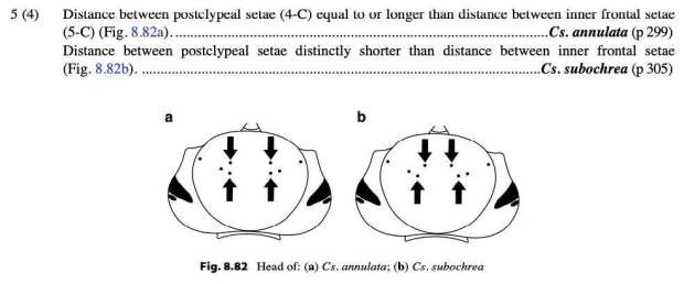 En este punto, para saber si estamos ante annulata o subochrea, hay que mirar con la lupa binocular una larva del estadio IV, el último antes de pasar a pupa. Hay que buscar las setas del postclípeo en la cabeza de la larva y medir la distancia entre ellas. En la imagen número 4 indico la ubicación de las sedas y la distancia que hay que medir. Con una fotografía y con la ayuda de un programa de tratamiento de imágenes se puede medir. En la imagen número 6, hay un recorte del libro de Becker et. al. con la dicotomía. Si la distancia entre las setas 4c es igual o mayor que entre las setas 5c, estamos ante annulipes, como es el caso. Y si la distancia entre las setas 4c es menor que entre las setas 5c, estamos ante subochrea.