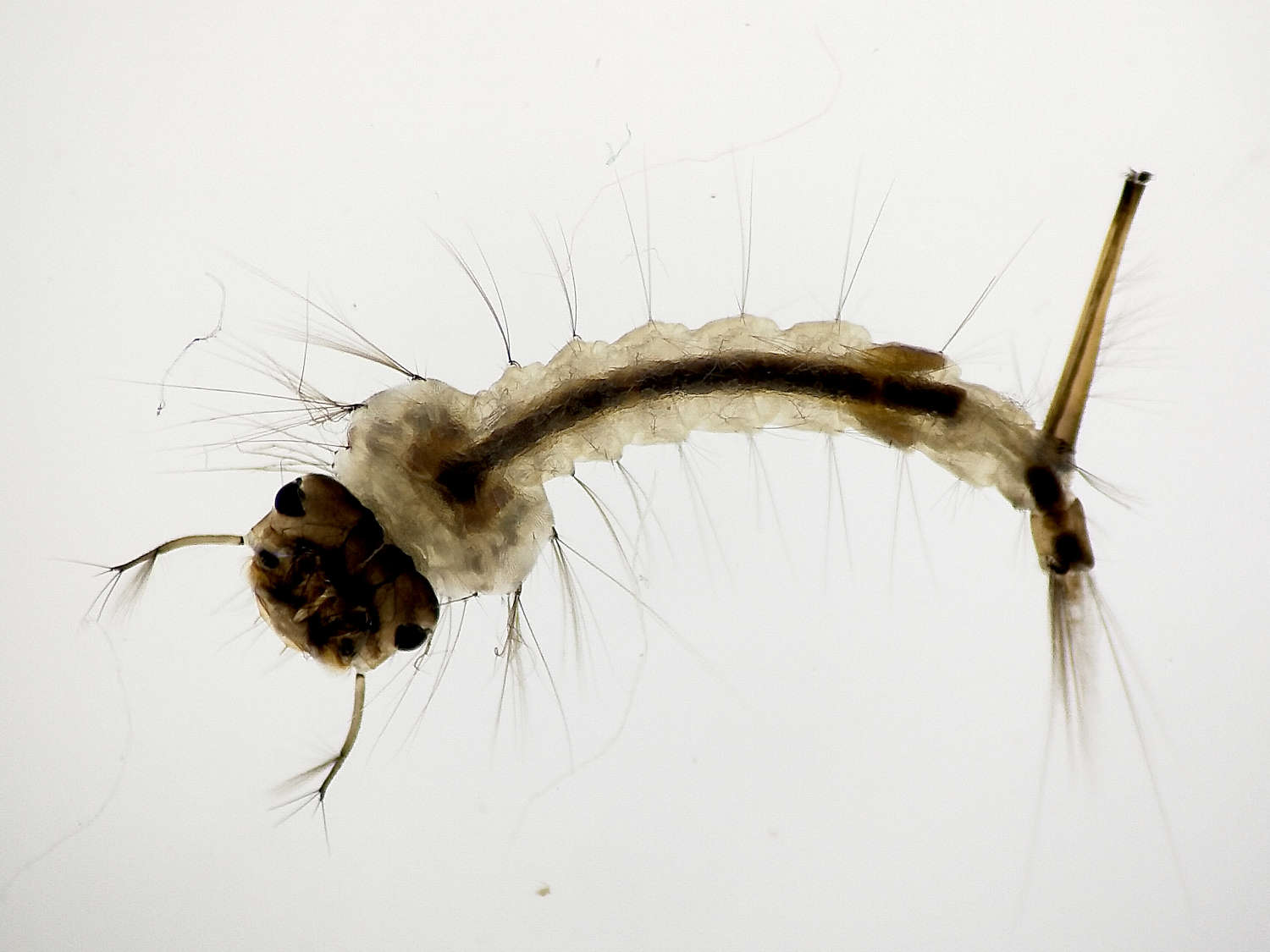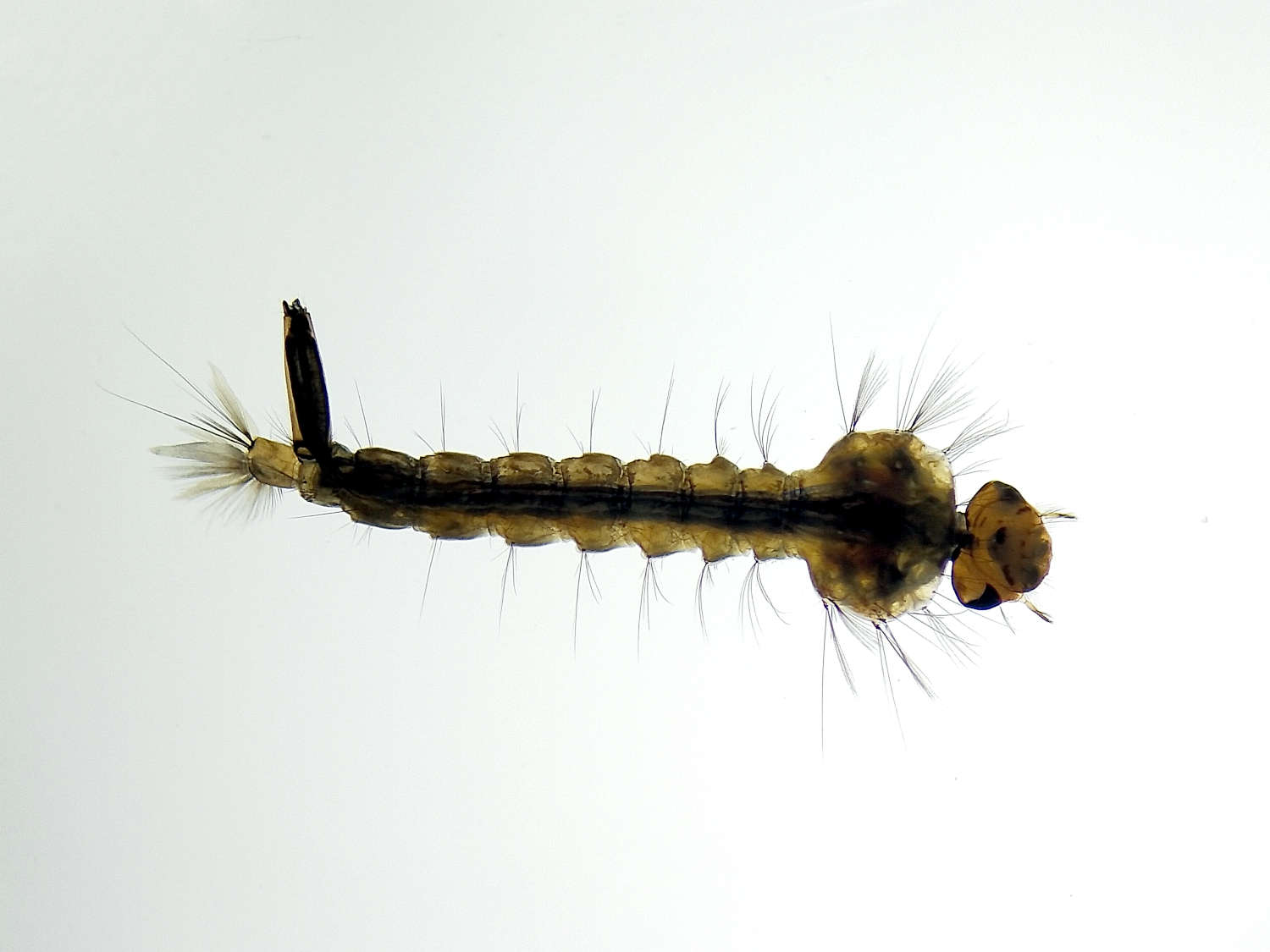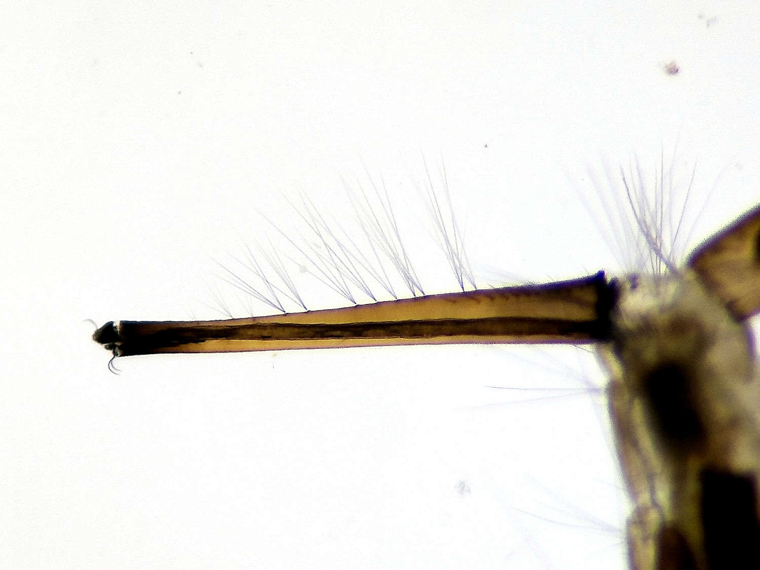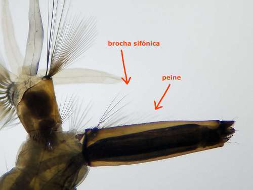 He utilizado las claves dicotómicas de la segunda edición de ‘Mosquitoes and their control’ de Becker et. al. [3]. Las larvas del género Culiseta tiene un sifón grueso que se puede confundir con el del género Aedes. La diferencia está en la posición de la brocha sifónica. En Culiseta se encuentra cerca de la base, en la parte baja del sifón entre los pelos del peine (figura 3). En Aedes la brocha sifónica está por encima del peine en la parte media del sifón. Respecto al subgénero Culiseta, el peine está formado por sedas largas en la parte medida del sifón (figura 3).