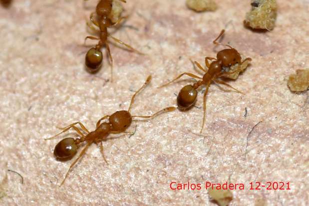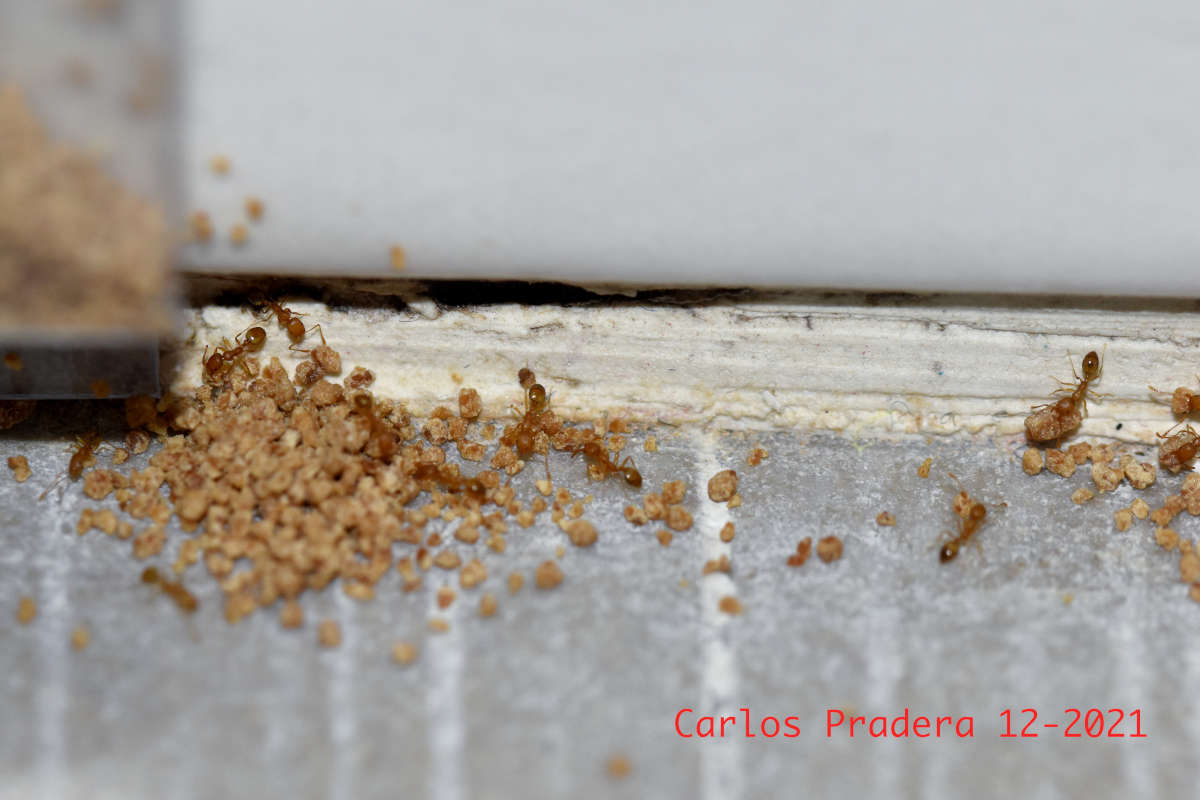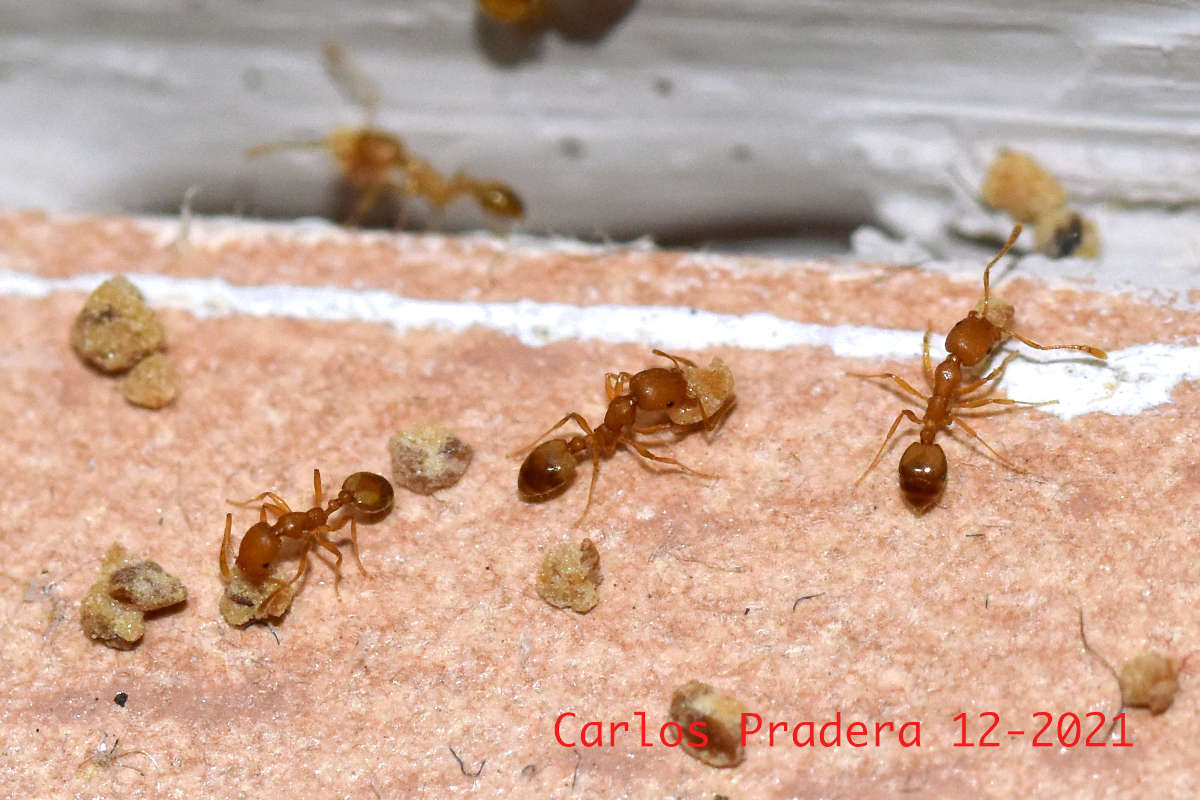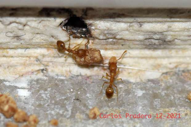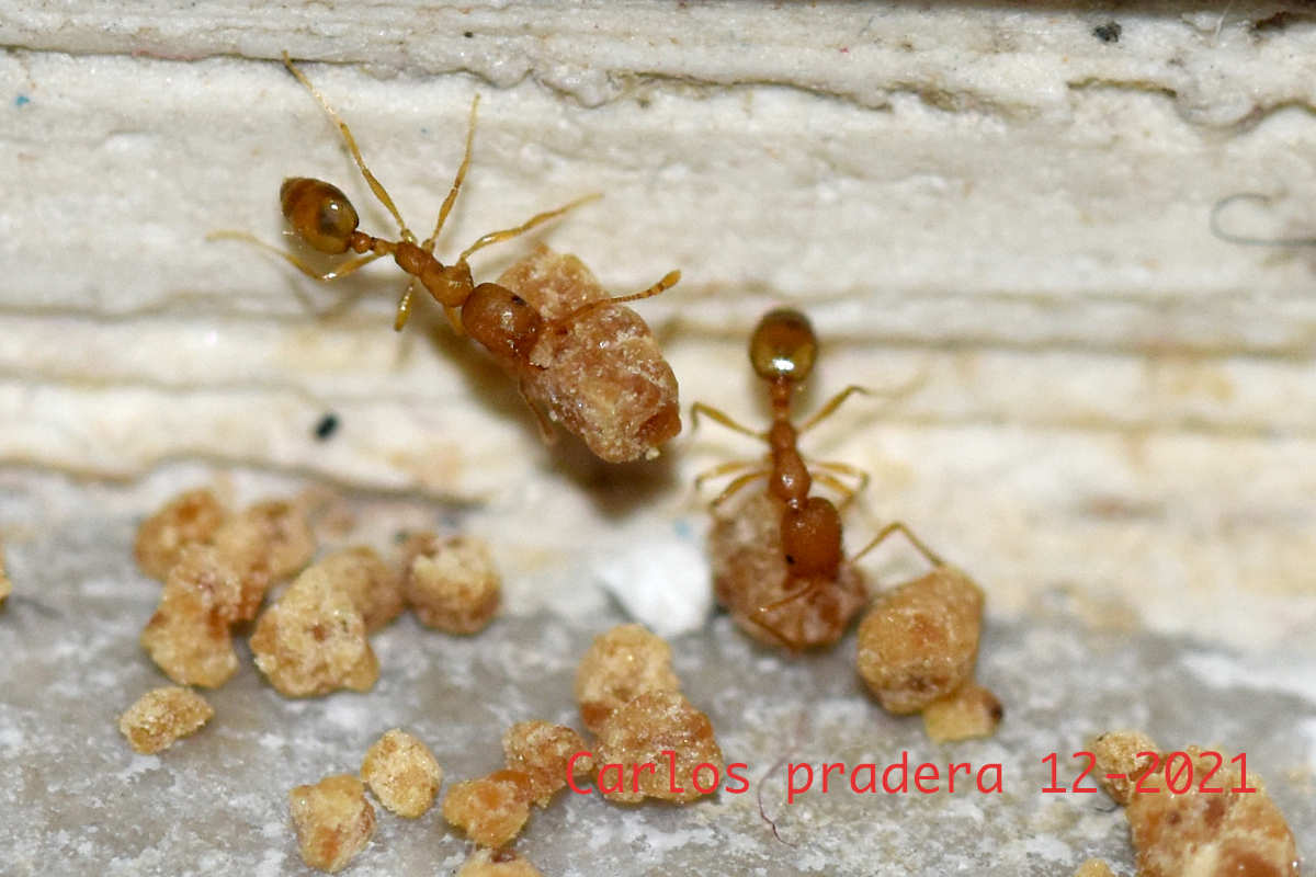 Fig 12. Obreras de M. pharaonis llevando el cebo./ C. Pradera 12-2021