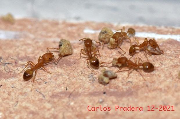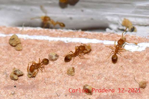 Fig 10. Obreras de M. pharaonis llevando el cebo./ C. Pradera 12-2021