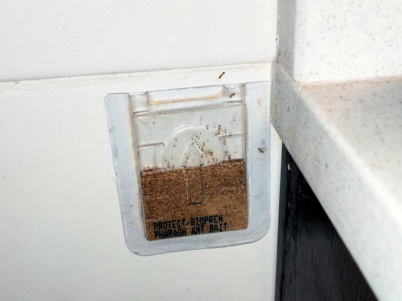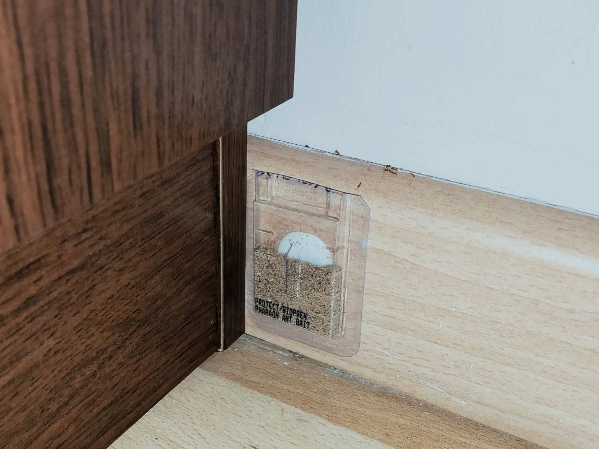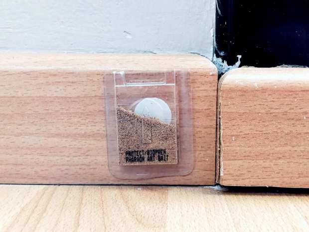 En las imágenes 10 a 16 se pueden ver fotografías de obreras llevando el cebo. Y en el vídeo se puede ver lo mismo. Hay que decir que el producto es muy atractivo para la hormiga faraón. Fue colocar un blíster en la zona de paso y al cabo de 10 minutos ya estaban entrando. Sin embargo, al aplicar el primer blíster quisimos facilitar que lo localizaran. Es por ello que se puede ver en las imágenes el cebo fuera del envase.