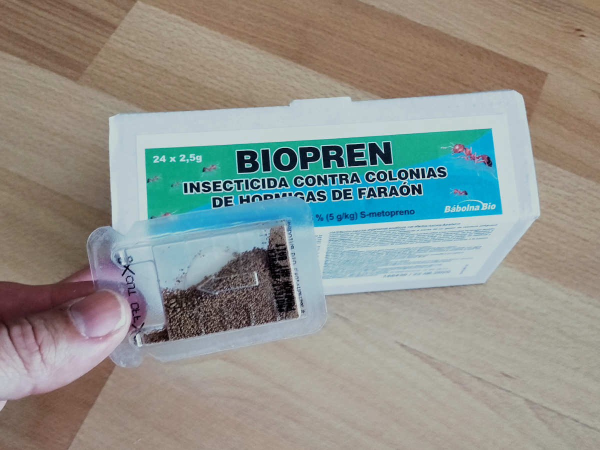 Hace cuatro años, en Expocida Iberia 2018, pude ver en el stand de Bábolna Bio un producto llamado Biopren BMS Pharaoh Ant Killer formulado con s-metopreno al 0.5%, un análogo de la hormona juvenil. Estuve un rato mirando el producto. Solicité un blíster que tenían de muestra y recogí información. Era un producto novedoso y dirigido contra la hormiga faraón (Monomorium pharaonis). No buscaba reducir una colonia de hormigas a base de matar obreras y, por ende, larvas y reproductores. El producto estaba pensado para hacer circular la materia activa. De esta manera, se inhibía la puesta de huevos e impedía la maduración de las larvas. En consecuencia se interrumpía el ciclo y no había reposición de obreras. La estrategia es como la que llevamos a cabo contra termita subterránea (Reticulitermes).