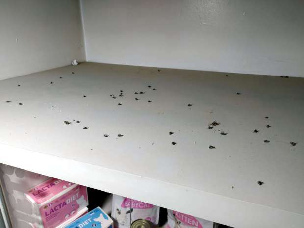 Nunca se ha visto nada. Solo se oye puntualmente alguna rata. Pero sí se huelen a veces a descomposición de cuerpos. Y esto implica que luego aparezcan moscardas. Ejemplo de lo dicho es lo que muestran las imágenes 1 y 2. Corresponden a una habitación con estanterías donde se guardan productos. Es la habitación que queda más cerca a la fábrica. Sobre las estanterías se acumulan moscardas. He recomendado su limpieza, pero allí hay ejemplares de por lo menos dos años. Esto es muy interesante porque me interesan las moscardas de la carne.