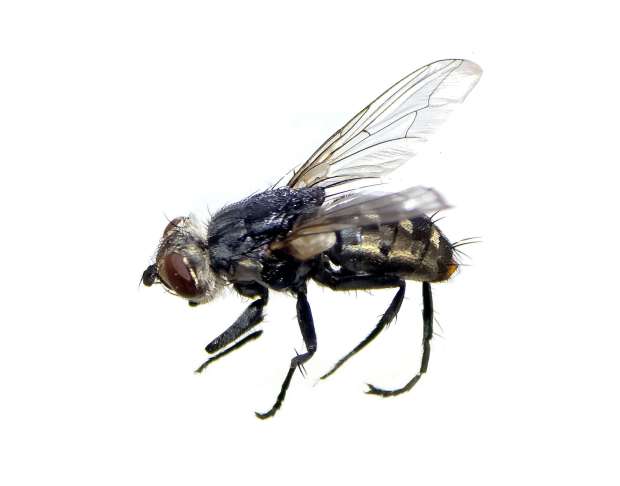 De hecho, el miércoles estaba revisando el consumo de cebo en el falso techo de esa habitación cuando me pregunté qué especies de moscarda debían haber. Observé dos de diferente tamaño y color (figura 3). La de mayor tamaño era alguna especie del género Sarcophaga (Sarcophagidae). En la imagen número 4, se puede ver uno de los ejemplares recolectados. Las llamamos de manera genérica como moscarda gris de la carne. Es difícil su determinación y no me he metido en ello. Son más de 70 especies de este género que tenemos en la Península Ibérica [1]. No me interesa por el momento.