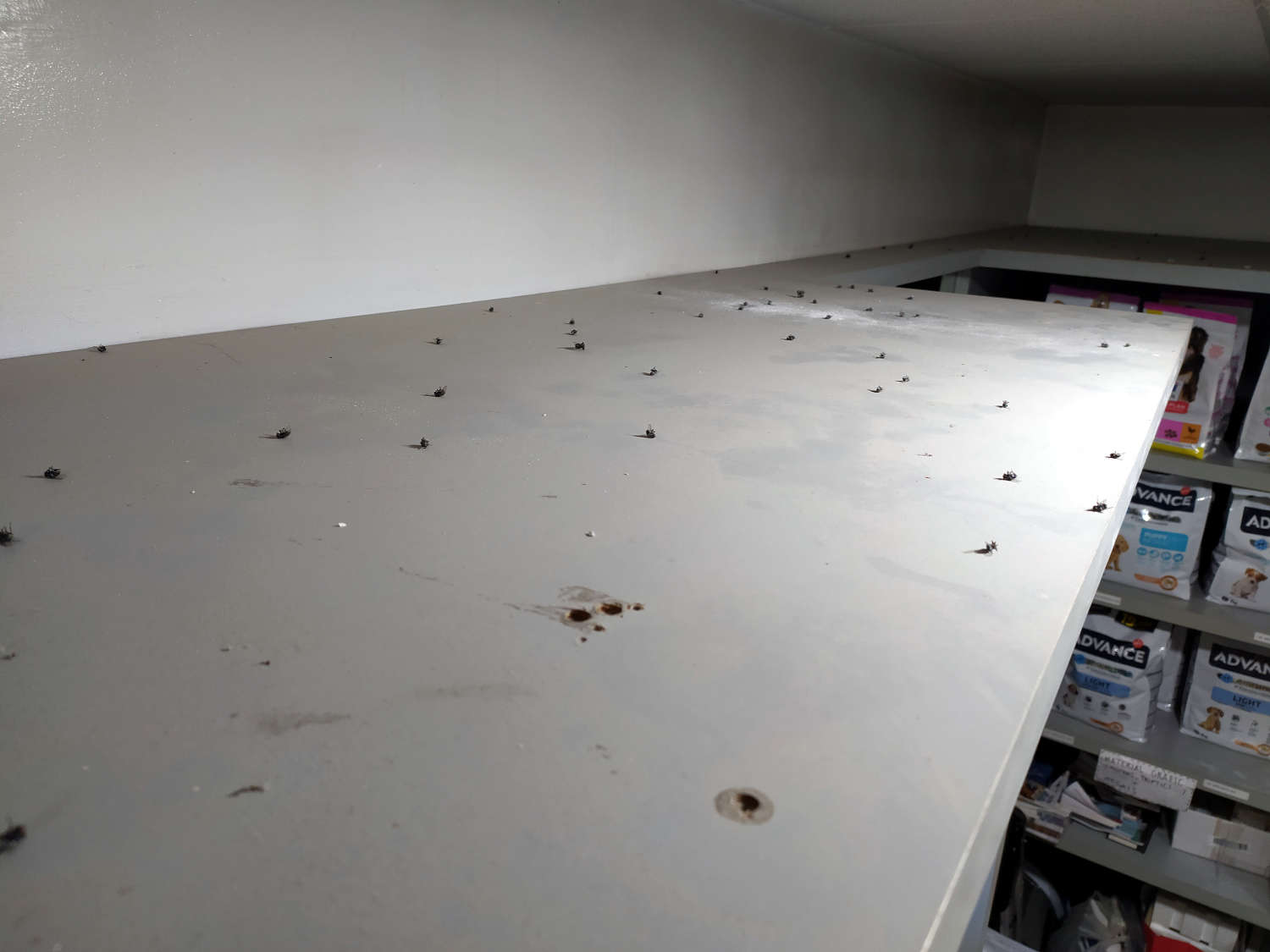 Nunca se ha visto nada. Solo se oye puntualmente alguna rata. Pero sí se huelen a veces a descomposición de cuerpos. Y esto implica que luego aparezcan moscardas. Ejemplo de lo dicho es lo que muestran las imágenes 1 y 2. Corresponden a una habitación con estanterías donde se guardan productos. Es la habitación que queda más cerca a la fábrica. Sobre las estanterías se acumulan moscardas. He recomendado su limpieza, pero allí hay ejemplares de por lo menos dos años. Esto es muy interesante porque me interesan las moscardas de la carne.
