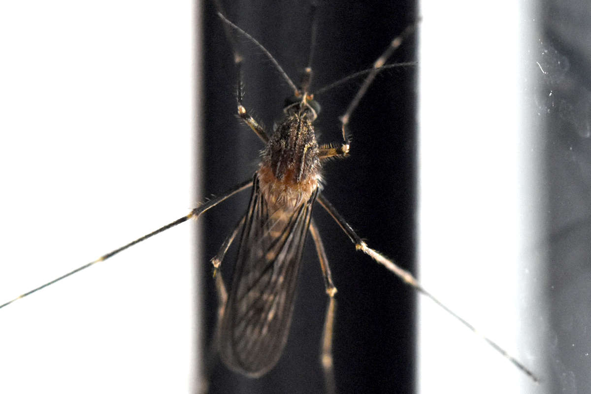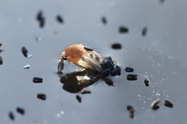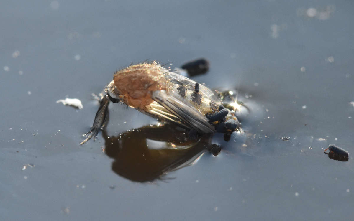 Fig 4. Macho de Culiseta fumipennis que no pudo emerger rodeado de colémbolos acuáticos de la familia Poduridae./ C. Pradera 05-2022