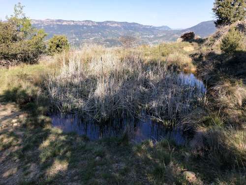 Aproveché para buscar larvas de mosquito. No encontré casi acumulaciones con agua en el núcleo. Me dijo un conocido que había un par de charcas. Me indicó una que estaba de camino a la ermita de la Virgen del Tozal. En la imagen número 2 se puede ver esta charca que estaba a unos 1.150 metros. Fue un lujo la biodiversidad que encontré. Estuve un rato buscando hasta que encontré unas pocas larvas y pupas dispersas. Cacé una larva y la observé con la lupa de bolsillo. Tuve una grata sorpresa porque nunca antes la había visto. No la reconocía. Me gustó su color verde. Entonces con un poco de paciencia recolecté una decena con la idea de llevarlas a casa y esperar que emergieran los adultos.