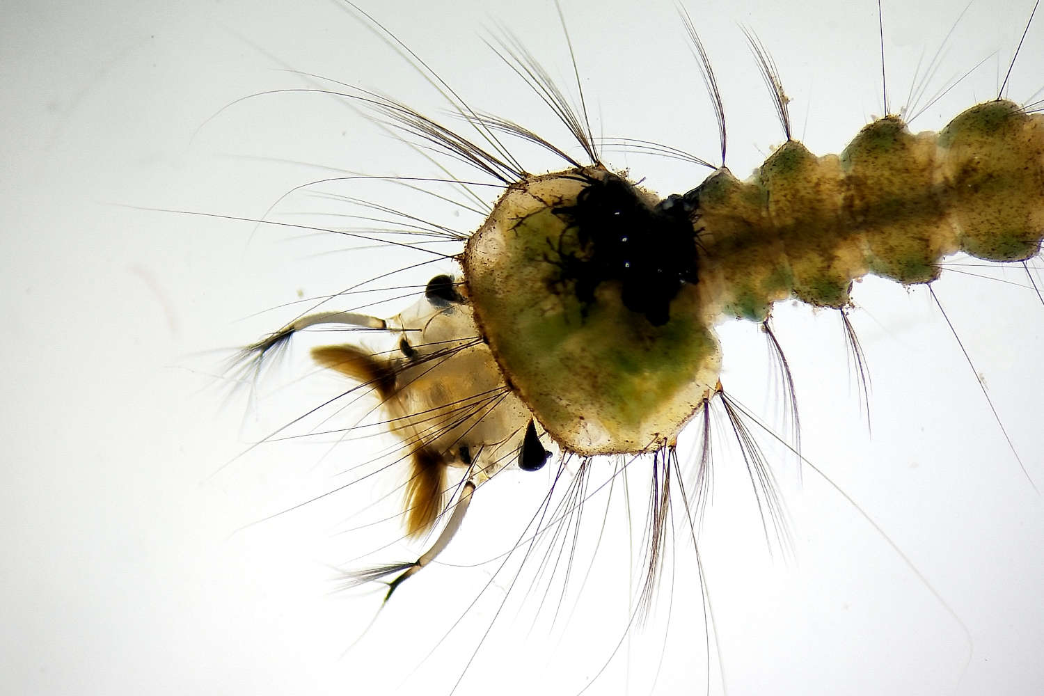En casa vi que se trataba de larvas del género Culiseta al tener la brocha sifónica en la parte baja. No costó su identificación porque tenemos pocas especies de este género en la península. Se trataba de Culiseta fumipennis. Tiene un sifón muy característico. En la imagen número 6 se puede ver la larva. Es de las más bonitas que he visto. Tiene un color verde particular y unos pelos largos. Me gusta la forma hexagonal del tórax en vista dorsal (figura 7). El sifón sirve para su diagnóstico. Es largo a diferencia de otras especies de Culiseta (figura 8). El peine ocupa 2/3 partes de su longitud y está formado por espinas. No tiene sedas. En la parte baja hay dos líneas cortas y paralelas de espinas muy juntas unas de otras. Luego tiene unas espinas más largas y separadas a lo largo del sifón. En el extremo del sifón destacan dos espinas largas en forma de gancho (figura 9) [1].