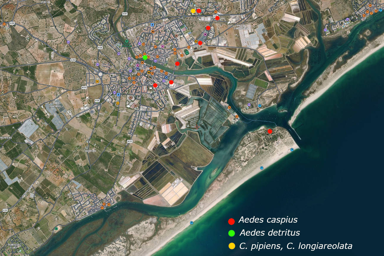 Buscando información sobre las especies de culícido de Portugal, he encontrado un artículo sobre su distribución que fue publicado en 2010 por Hugo C. Osório et al. [1]. El trabajo consistió en la captura de adultos entre 2005 y 2008 mediante trampas de luz CDC cebadas con CO2 que fueron situadas en 48 localidades. Para el distrito de Faro, que comprende lo que denominamos el Algarve, encontraron 12 especies. En orden de abundancia, estas son: Ae. caspius (56.9%), Cx. pipiens (28.9%), Cx. theileri (10.8%), Ae. detritus (1.2%), An. algeriensis (<1.0%), An. maculipennis (<1.0%), Cq. richiardi (<1.0%), Cs. annulata (<1.0%), Cs. longiareolata (<1.0%), Cx. modestus (<1.0%), Cx. perexiguus (<1.0%) y Ur. unguiculata (<1.0%).