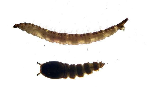 Ahora bien, además de estas dos especie típicas de marismas de la península Ibérica, encontré otras dos urbanas también típicas ibéricas, Culex pipiens y Culiseta longiareolata (figura 13). De hecho, durante la primera noche oí el típico zumbido que delata a Cx. pipiens, nuestro mosquito común, en el dormitorio. Al día siguiente busqué el origen y di con un imbornal arenero que estaba a unos 10 metros del apartamento (figuras 14-16). De todos los imbornales que había, solo ese contenía agua. Más tarde observé que el agua provenía del exceso de riego. Cada día por la tarde había una pequeña aportación de agua, suficiente como para que en el imbornal hubiera gran cantidad de larvas de ambas especies. El agua estaba cargada de materia orgánica y tenía olor fuerte. Recolecté una muestra para ver qué especies había. Ademas de estas dos de mosquito, encontré otras especies de dípteros de ciclo larvario acuático como Chironomus (Chironomidae) y Clogmia albipunctata (Psychodinae) (figura 17).