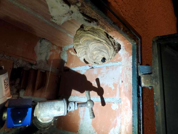 El pasado lunes 13 de junio tuvimos aviso de avispa asiática (Vespa velutina) instalada en el cajón del contador de agua de una vivienda. Este es un lugar típico donde la hembra reproductora (reina) puede fundar una nueva colonia en primavera. Por lo menos esto es lo que detectamos cada año en nuestra zona. Estos cajones disponen, por lo general, de agujeros en la tapa por los que pasan las avispas. En este espacio están protegidas y tienen las condiciones para fundar la colonia.
