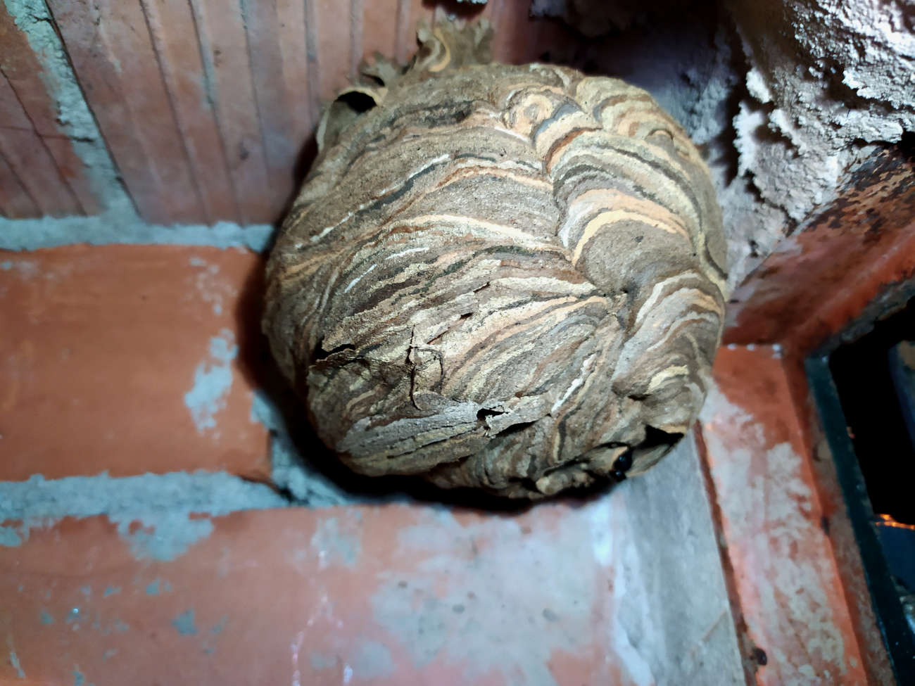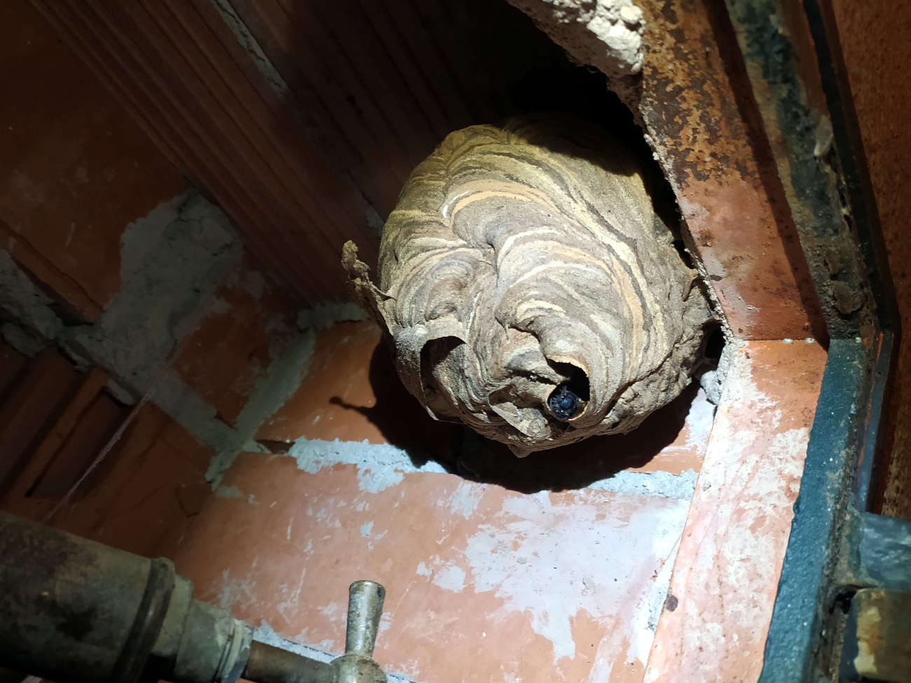 El caso del pasado lunes nos llegó a través de un ayuntamiento por queja puesta por el propietario de la vivienda. Se había dado cuenta de que las avispas habían anidado en el cajón. Creía que eran avispas típicas del país, es decir, Polistes. Tomó un bote de insecticida y pulverizó. Al salir las obreras, se apartó rápido, pero una acabó picándole. Se dio cuenta de que eran asiáticas. Al poco sintió que no se encontraba bien y empezó a sentir en las palmas de las manos y pies un hormigueo. Así que se armó de valor y se fue rápido al hospital. Allí estuvo unas horas. Le administraron adrenalina, antihistamínicos y cortisona, según me explicó. Esto sucedió el día anterior, el domingo. En cuanto nos llegó el aviso, fuimos por la noche a eliminar el avispero.