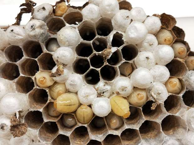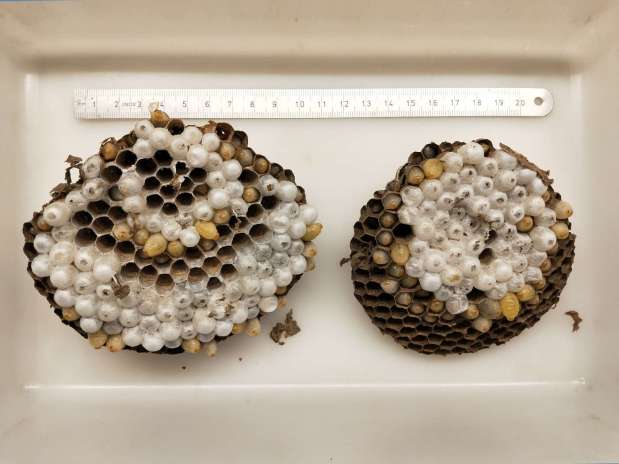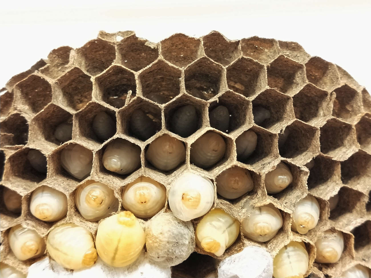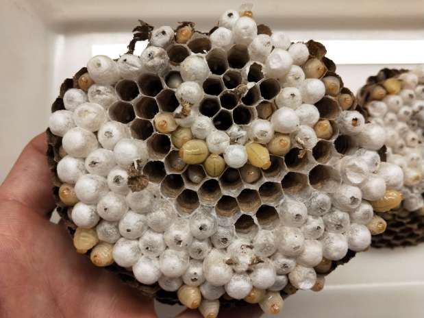 En casa separé la reina reproductora, las obreras y los machos (figura 13). Sí, los machos. Lo que sorprende de una colonia de avispa asiática es que puedan aparecer machos en un avispero primario. Esto no es algo raro, según mi observación. Es difícil de entender, porque los machos en principio no tienen más función que la de reproducción. Así que alimentar larvas de macho en esta época del desarrollo de la colonia es un derroche de energía. Además carecen de aguijón para defender la colonia. Según se cree, estos machos nacen de huevos puestos por las obreras. En efecto, las obreras ponen huevos. Es por ello que si hacemos un tratamiento contra avispa asiática a la luz del día y no eliminamos todos los individuos, nos podemos encontrar que las obreras que hayan sobrevivido construyan un nuevo avispero y pongan huevos de los que nazcan machos.