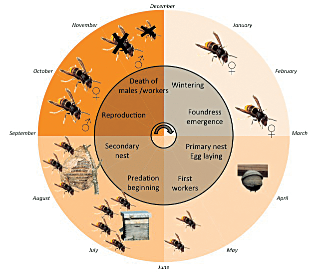 En la imagen número 2, se puede ver un gráfico sobre el ciclo de vida de la avispa asiática. Está extraído de un artículos de 2016 de K. Monceau y D. Thiery [2]. Se puede ver el típico ciclo de un véspido social que nosotros conocemos por especies comunes como las del género Vespula. Al final del verano, se prepara la colonia para producir reproductores, machos y hembras. Luego se produce la cópula y las hembras marchan para sobrevivir al invierno e iniciar una nueva colonia. Sin embargo, en el caso de Vespula, las obreras no ponen huevos.