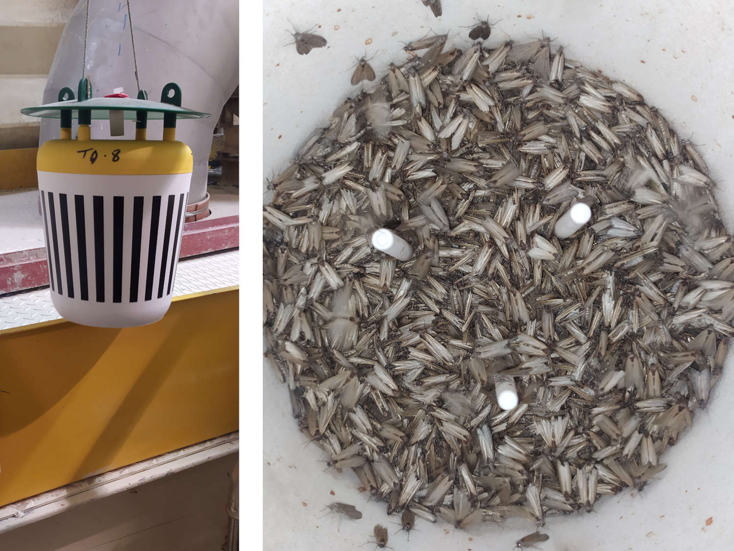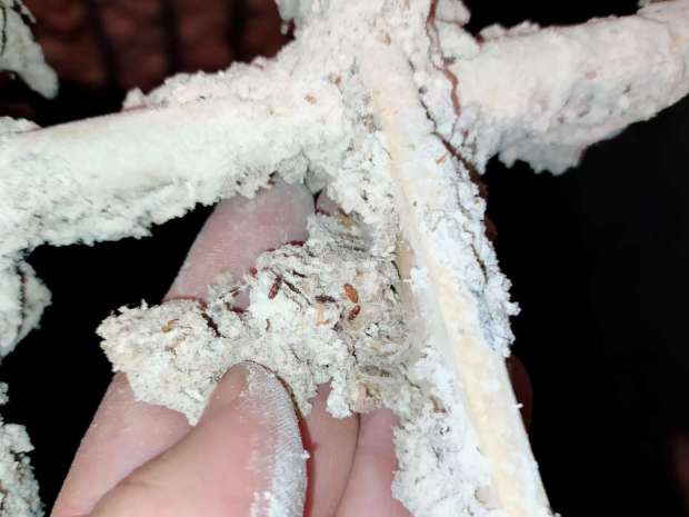 En esta entrada quiero mostrar un caso típico de gran infestación de polilla mediterránea de la harina, Ephestia kuehniella (figuras 1 y 2). Como se puede ver en el vídeo, las larvas han ido cubriendo el interior de un silo de harina con sus sedas y capullos. Las larvas segregan una seda que no solo permite construir el capullo donde pupar, sino que les permite ayudarse en su supervivencia adhiriéndose a superficies. Con el tiempo, el interior del silo ha quedado totalmente cubierto de una gruesa capa de pupas y sedas (figura 3). En este lugar tienen el alimento y las condiciones ambientales para su desarrollo. La harina es un material que absorbe humedad.