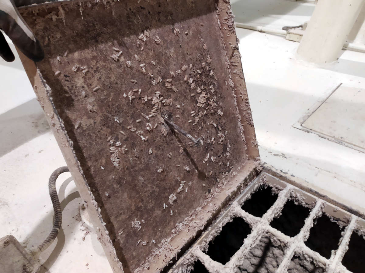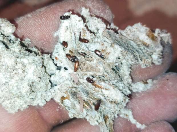 Pero esta capa gruesa es propiamente un sustrato que permite el desarrollo no solo de nuevas generaciones de E. kuehniella, sino de otros insectos plaga de los productos almacenados. En las imágenes 4 y 5, se pueden ver coelópteros del género Tribolium. Como sabemos, estos coleópteros son plaga secuandaria de los granos, pero primaria de la harina y otros materiales. Son insectos que se adaptan bien y devienen una plaga si no se les pone freno. En el caso que muestro, se encuentran a gusto en el sustrato dentro del silo. Y he de apuntar que la plaga en esta fábrica solo se encuentra en los silos. Fuera está todo en un nivel bajo.