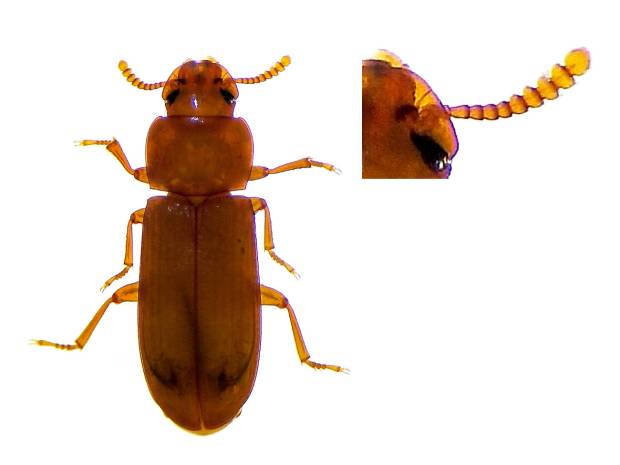 En cuanto a la identificación de la especie de Tribolium, curiosamente lo que he podido identificar es Tribolium confusum. Un ejemplar se puede ver en la l imagen número 6. La antena es clara: primer artejo largo y maza antenal de 5 artejos. No descarto que aparezca también T. castaneum, ya que ambas especies pueden convivir. Otro coelóptero que también encontré en el sustrato, aunque en muy bajo número, fue Cryptolestes. En la imagen número 7, se puede ver uno de los ejemplares. Es difícil la identificación de las especies de este género, pero todo apunta a que se trataría de Cryptolestes pusilloides.