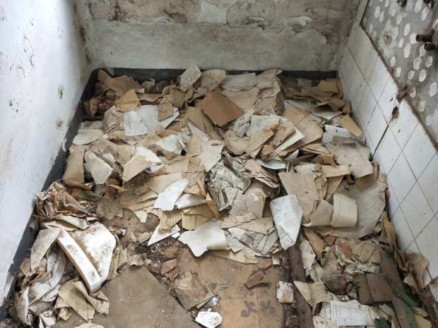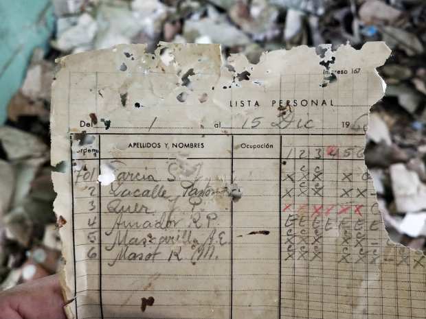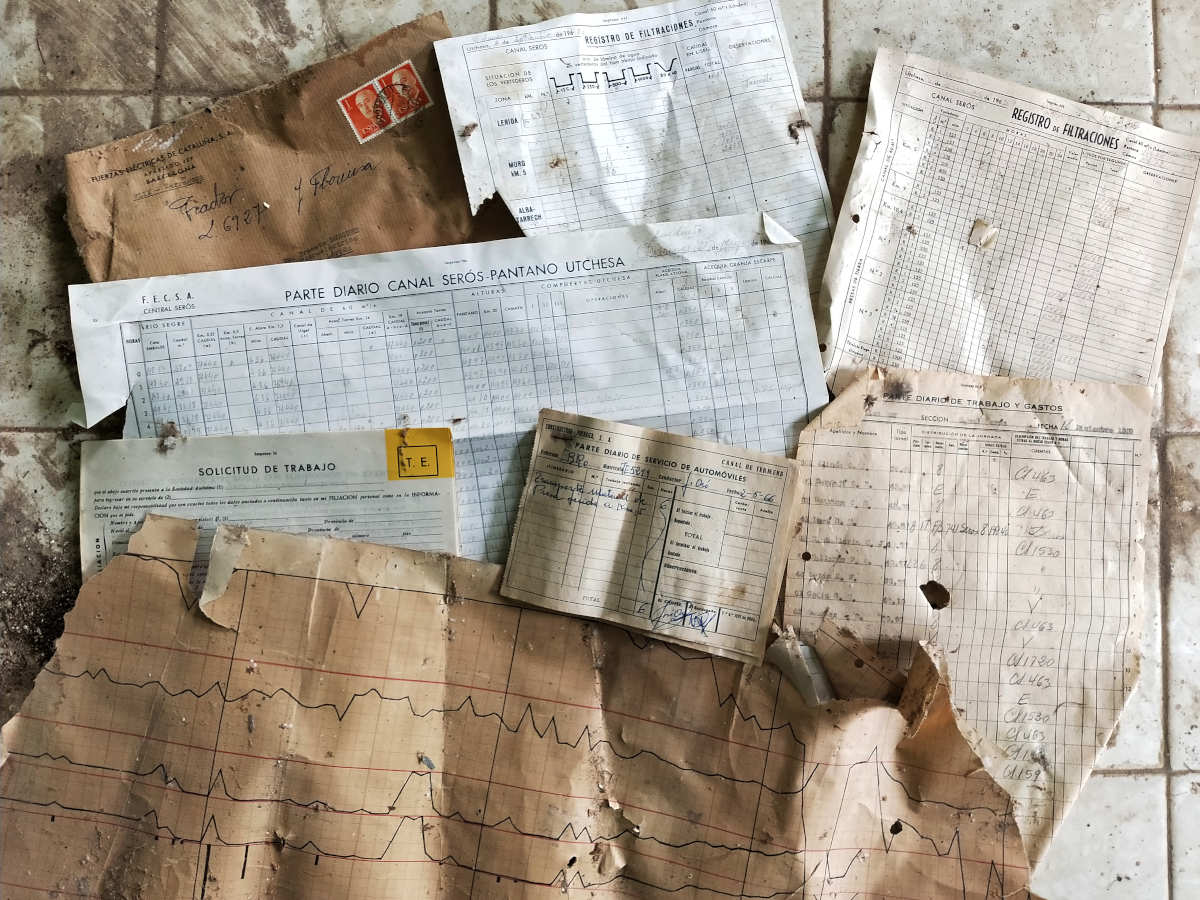 Junto al embalse se encuentra un pequeño edificio de una sola planta que servía como oficina de los trabajadores del mantenimiento de la infraestructura (figura 3). En la actualidad, sigue en pie, pero las puertas y ventanas están rotas por lo que se puede acceder sin problemas. Pues bien, en 2017 entré y vi que el suelo se encontraba lleno de viejos papeles fechados entre finales de la década de 1960 y principios de la siguiente. Había contratos, registros de temperatura, capacidad, etc. (figuras 4-9). Como soy curioso, tomé uno para ver su contenido. Y entonces vi correr un pececillo de plata o lepisma. Recolecté algunos.