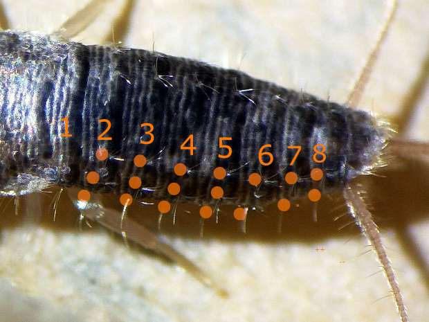 Respecto a las dos especies de Ctenolepisma exóticas, ¿cómo las diferenciamos? Son parecidas en forma y color gris oscuro. Necesitamos la ayuda de la lupa binocular. En general, el género Ctenolepisma es fácil de identificar si miramos la cabeza redonda llena de brochas. C. lineata es marrón, tiene cuatro bandas blancas y el cuerpo del adulto pasa el centímetro hasta los 13 mm. En el caso de C. longicaudata también sobrepasa el centímetro hasta los 15 mm. Pero no es el caso de C. targionii que es un poco más pequeña, aproximadamente 10 mm. Además de la longitud, hay que mirar las cerdas laterales del abdomen que están agrupadas en mechones. Esto se ve en la figura número 1 donde muestro el abdomen de un ejemplar de C. targionii. En este caso, se presentan tres mechones laterales entre el terguito II y el V. Ahora bien, en el caso de C. longicaudata, los mechones van del terguito II al VI. Las hembras de ambas especies tienen dos pares de estilos. Como apunte, C. lienata presenta tres mechones del terguito II al VII y la hembra tiene tres pares de estilos.